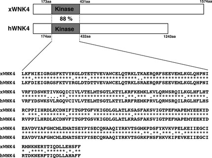 Figure 1. Alignment of the Xenopus WNK4 (xWNK4) and human WNK4 (hWNK4). The conserved amino acids are represented by asterisks (*). The kinase domains have high identity (88%) and are shaded gray.