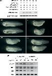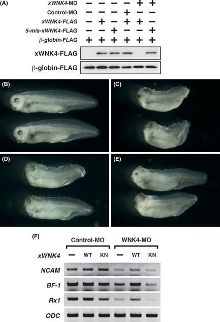 Figure 3. xWNK4 functions in anterior neural development. (A) Morpholino (MO) (20 ng) and FLAG-tagged mRNAs (1000 pg) were co-injected with β-globin-FLAG mRNA (200 pg) as loading control into the animal poles of 4-cell stage embryos, and the injected animal caps were dissected at stage 10. Lysates from the animal caps were subjected to Western blotting with anti-FLAG antibody (M2, Sigma). (B-E) Phenotypes of injected embryos at stage 35. Control-MO (30 ng) or xWNK4-MO (30 ng) was co-injected with xWNK4 mRNA (1000 pg) or kinase negative xWNK4 mRNA (1000 pg) into two dorso-animal blastomeres of 8-cell embryos. (B) Control-MO. (C) xWNK4-MO. (D) xWNK4-MO with xWNK4 mRNA. (E) xWNK4-MO with kinase negative xWNK4 mRNA. (F) RT-PCR analysis of neural marker genes, NCAM (pan-neural), BF-1 (forebrain) and Rx1 (eye). RNAs from head regions of injected embryos were extracted at stage 25.
