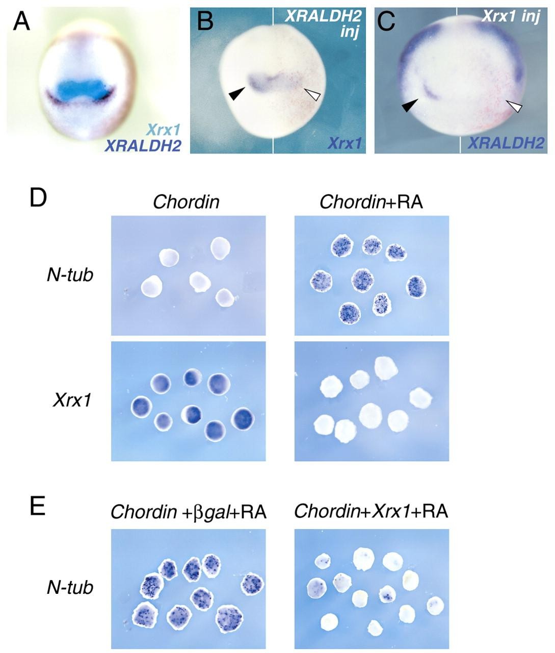Fig. 3. Xrx1 counteracts retinoic acid-mediated neuronal differentiation. (A) Comparison of the anterior expression of XRALDH2 (purple) with that of Xrx1 (light blue) in a stage 13 embryo. (B) Stage 13 embryo injected with XRALDH2 showing reduction of Xrx1 expression. (C) Stage 13 embryo injected with Xrx1 showing repression of the anteriorXRALDH2 expression domain. Black arrowheads indicate the expression domains of Xrx1 (B) and XRALDH2 (C) in the uninjected side of the embryos. White arrowheads indicate the repression of the corresponding domains in the injected side. (A-C) Frontal views, dorsal towards the top. Red staining represents expression of co-injected lacZ lineage tracer. (D) Animal caps injected with chordin and analyzed at stage 16 express Xrx1 but not N-tubulin. If chordin-injected caps are treated with RA at stage 9 and analyzed at stage 16, Xrx1 expression is suppressed and N-tubulin expression is induced. (E) Stage 16 animal caps co-injected with either chordin and lacZ (control) or chordin and Xrx1, and treated with RA at stage 9. Xrx1 strongly inhibits the induction of N-tubulin expression.