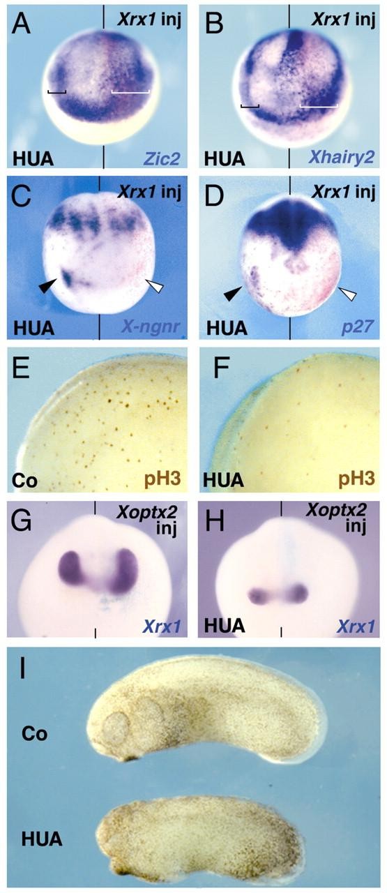 Fig. 6. (A-D) Embryos injected with Xrx1 were treated with HUA at stage 10.5 and the expression of Zic2 (A), Xhairy2 (B), X-ngnr-1 (C) and p27Xic1 (D) was analyzed at stage 13. (A,B) Black brackets indicate the anterior expression domains in the uninjected side; white brackets indicate the corresponding enlarged domains in the injected side. (C,D) Black arrowheads indicate anterior expression domains in the uninjected side, white arrowheads indicate the absence of this expression domain in the injected side. (E-I) HUA treatment dramatically reduced anti-phosphoH3 staining (E,F; stage 16) as well as Xoptx2 ability of expanding Xrx1 (Zuber et al., 1999) (G,H; stage 18). This treatment also results in a reduction of the optic vesicle size (I; stage 26; Co, control untreated embryo). (A-D,G,H) Frontal views, dorsal towards the top; (E,F,I) lateral views, anterior towards the left. Red staining in A-D and turquoise staining in G,H represent expression of co-injected lacZ lineage tracer. The injected side of the embryos (to the right of vertical bars representing the midline) is indicated (inj).