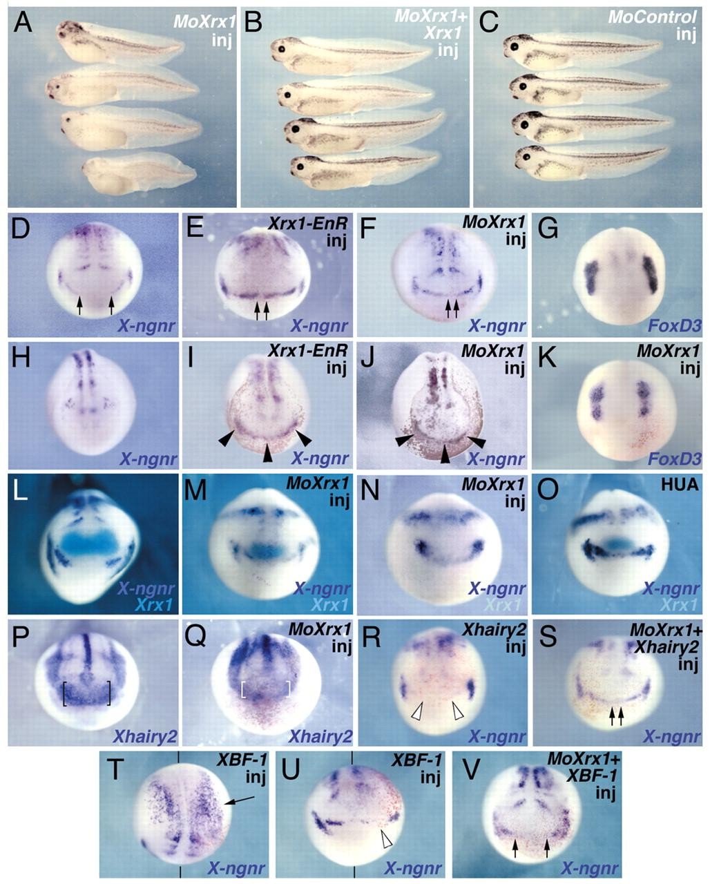 Fig. 8. Effects of Xrx1 loss of function on genes regulating anterior neurogenesis. (A-C) Phenotypes of stage 41 embryos injected with MoXrx1 (A), MoXrx1 and Xrx1 (B), and control morpholino oligo (C). (F,J,K,M,N,Q) Embryos injected with MoXrx1 in both dorsoanimal blastomeres at the eight-cell stage and analyzed at stage 14 (F,K,M,N,Q) and stage 18 (J). (D,G,H,L,P) Control uninjected embryos analyzed at stage 14 (D,G,L,P) and stage 18 (H). (E,I) Embryos bilaterally injected with Xrx1-EnR analyzed at stage 14 (E) and stage 18 (I). (O) Stage 14 embryo treated with HUA. (R,S,V) Stage 14 embryos bilaterally injected with Xhairy2 (R), MoXrx1 and Xhairy2 (S), and MoXrx1 and XBF-1 (V). (T,U) Dorsal (T) and frontal (U) views of a stage 14 embryo injected with XBF-1. Red staining represents co-injected lacZ. Black brackets indicate the size of the anterior expression domain in the uninjected embryo (P); white brackets indicate the size of the corresponding domain in the injected embryo (Q). Arrows in D,E,F,S,V indicate the anterior boundaries of X-ngnr-1 expression; the arrow in T indicates X-ngnr-1 ectopic expression. Black arrowheads in I,J indicate the continuous anterior extension of X-ngnr-1 expression. White arrowheads in U and R indicate the repressed anterior expression domain of X-ngnr-1.