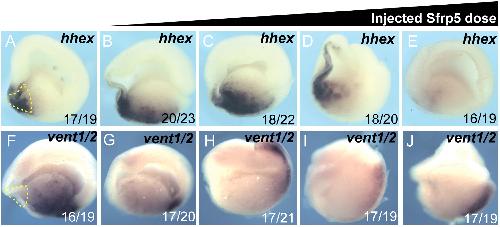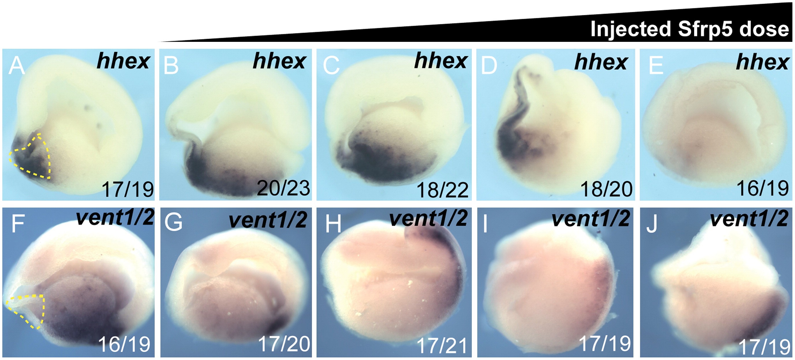 Fig. 1. Differential Wnt signaling patterns the Xenopus endoderm. Wnt signaling has different thresholds in the endoderm. Embryos were injected with a dose range of mRNA encoding Sfrp5; 500 pg (B,G), 800 pg (C,H), 2 ng (D,I) and 3 ng (E,J). In situ hybridization for hhex (AâE) and vent1 and vent2, a mixture of both probes referred to as vent1/2 (FâJ) in stage 19 bisected embryos showed that low doses of Sfrp5 expanded the hhex expression domain (yellow dashed line) (BâD) at the expense of hindgut markers vent1/2 (GâI). The highest dose of Sfrp5 resulted in a loss of hhex (E). The number of embryos with the illustrated phenotype is indicated in each panel. |