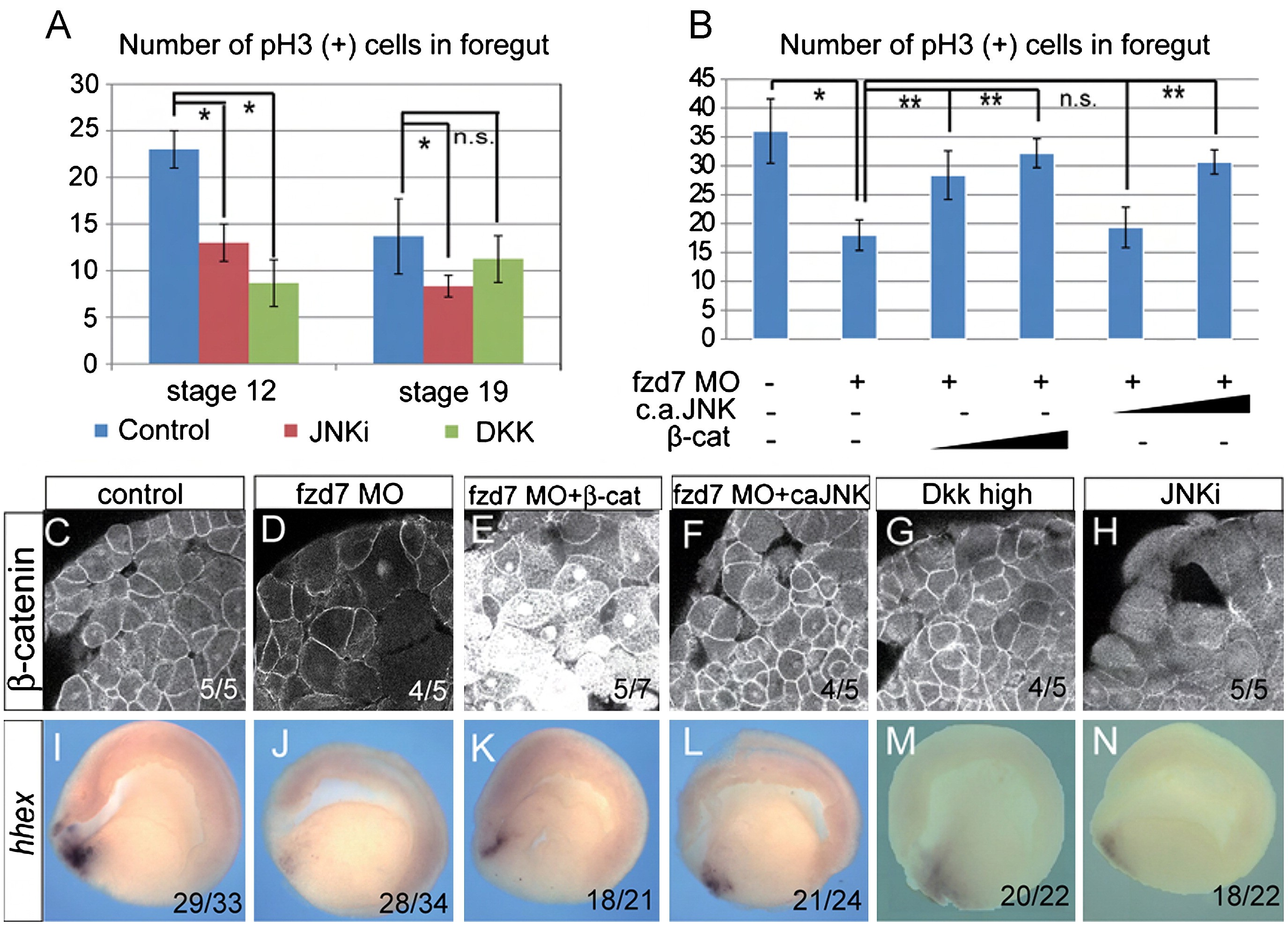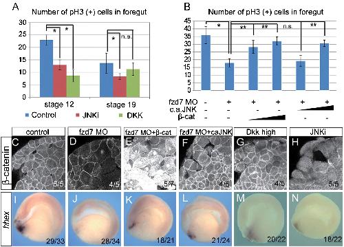Fig. 6. Fzd7 signals via both β-catenin and JNK coordinate foregut cell proliferation, gene expression and cell morphology. (A) Inhibition of either Wnt/β-catenin or JNK pathways reduced foregut cell proliferation. Embryos were either injected with RNA encoding Dkk1 (500 pg) to block the Wnt/β-catenin pathway or treated with the cell soluble JNK inhibitor SP600125 (JNKi; 100 μM). Mean number of PH3 positive cells in the foregut +/âS.D. *po0.05 and ** po0.01compared to controls (n1â44 embryos/ condition). (B) Activation of either β-catenin or JNK signaling rescued cell proliferation in Fzd7 morphants. Embryos were injected with fzd7-MOs (50 ng) with or without RNA encoding a constitutively active JNK (c.a. JNK; 200 pg) or a hormone inducible GR:Lef-βCTA (β-cat; 200 pg) activated by 1 μM dexamethasone at stage 11. Mean number of PH3 positive foregut cells at stage 12 7S.D. *po0.05 relative to control and **po0.05 relative to fzd7-MO alone in Student's t-test (n1â44 embryos/ condition). (C) Fzd7/ JNK signaling regulates cell shape. Confocal immunostaining of β-catenin at stage 20 showed that c.a.JNK injection (F) rescued the cell-size defects in Fzd7 morphants (D), whereas activation of the GR:Lef-βCTA (β-cat) did not (E). The JNK inhibitor (JNKi) caused a reduction of cytoskeletal β-catenin and increased cell size (H), phenocopying fzd7- MO (D), whereas Dkk1 (1.5 ng) had no effects on cell morphology (G). (I) Both Fzd7/β-catenin and Fzd7/JNK regulate gene expression. In situ hybridization to stage 20 embryos showed that co-injection of either GR:Lef-βCTA (β-cat) (K) or c.a.JNK (L) restored hhex expression in Fzd7 morphants (J), whereas the JNK inhibitor (N) or high levels of Dkk1 (1.5 ng) (M) suppressed hhex. The number of embryos with the illustrated phenotype is indicated in each panel. |