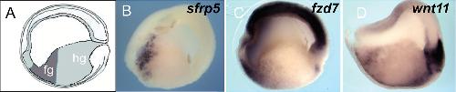Figure S1. Expression pattern of fzd7, sfrp5, and wnt11: (A) Schematic of an early somite stage Xenopus embryo showing foregut (fg) and hindgut (hg) progenitors, adapted from (Li et al., 2008). (B) In situ hybridization to stage 180 bisected embryos shows expression of sfrp5 (B), fzd7 (C) and wnt11 (D). |