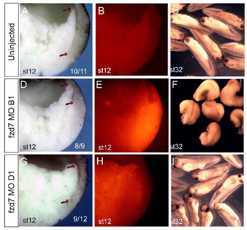Figure S3. Loss of Fzd7 in endoderm does not cause defects in Brachet's cleft formation or gastrulation (A,D,G) Bright field and fluorescent images (B, E, H) of bisected gastrula show that the formation of Brachet's cleft between the mesendoderm and the ectoderm (red arrows) of the dorsal lip (A, B) was inhibited by injection of fzd7-MOs into B1 cells at the 32-cell stage mesodermal cells (D, E), as previously published (Winklbauer, R., Medina, A., Swain, R. K. and Steinbeisser, H. (2001) 'Frizzled-7 signalling controls tissue separation during Xenopus gastrulation', Nature 413(6858): 856-60). However, injection of the fzd7-MOs into the D1 cells had little is any impact on tissue-separation (G,H). (C, F) At stage 32 B1-injected embryos exhibited typical bent axis and spina bifida, consistent with the known role of Fzd7 in convergent extension of the axial mesoderm. In contrast D1-injected embryos did not have axial defects but rather exhibited foregut edema. |