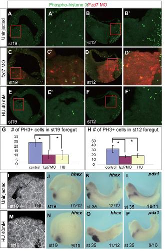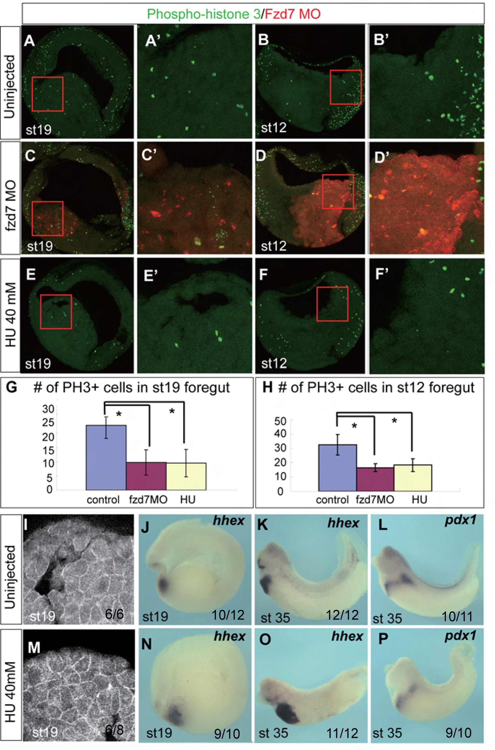 Figure S4. Inhibition of cell proliferation cannot account for disrupted foregut morphology or loss of gene expression (A-F) Confocal immunostaining at stage 12 and 19 for phospho-histone h3 (PH3+; green) in control (A, B), fzd7-MO (red) injected (C, D) or embryos treated with 20 mM hydroxyurea (HU) to inhibit proliferation (E, F). Quantitation at (G) stage 19 and (H) stage 12 showed that the mean number of PH3+ cells +/− S. D. (n=4 embryos/condition) in the foregut was reduced to comparable levels in Fzd7-depleted and HU treated embryos *p<0.05 relative to age matched controls in T-test (I, M) Confocal immunostaining ofcortical β-catenin showing that HU treatment does not cause foregut morphogenesis defects. (J-P) In situ hybridization shows HU does not reduce expression of foregut markers hhex or pdx1. The number of embryos with the illustrated phenotype is indicated in each panel. |