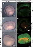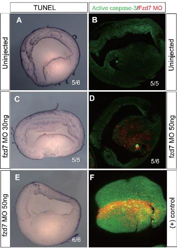 Figure S5. Loss of Fzd7 does not cause ectopic apoptosis: (A, C, E) TUNEL and (B, D, F) active-caspase-3 immunostaining (green) showed that fzd7-MO embryos did not exhibit elevated apoptosis at stage 19, whereas injection of a +control MO that is known to induce apoptosis exhibits robust caspase-3 activity (F). The number of embryos with the illustrated phenotype is indicated in each panel. |