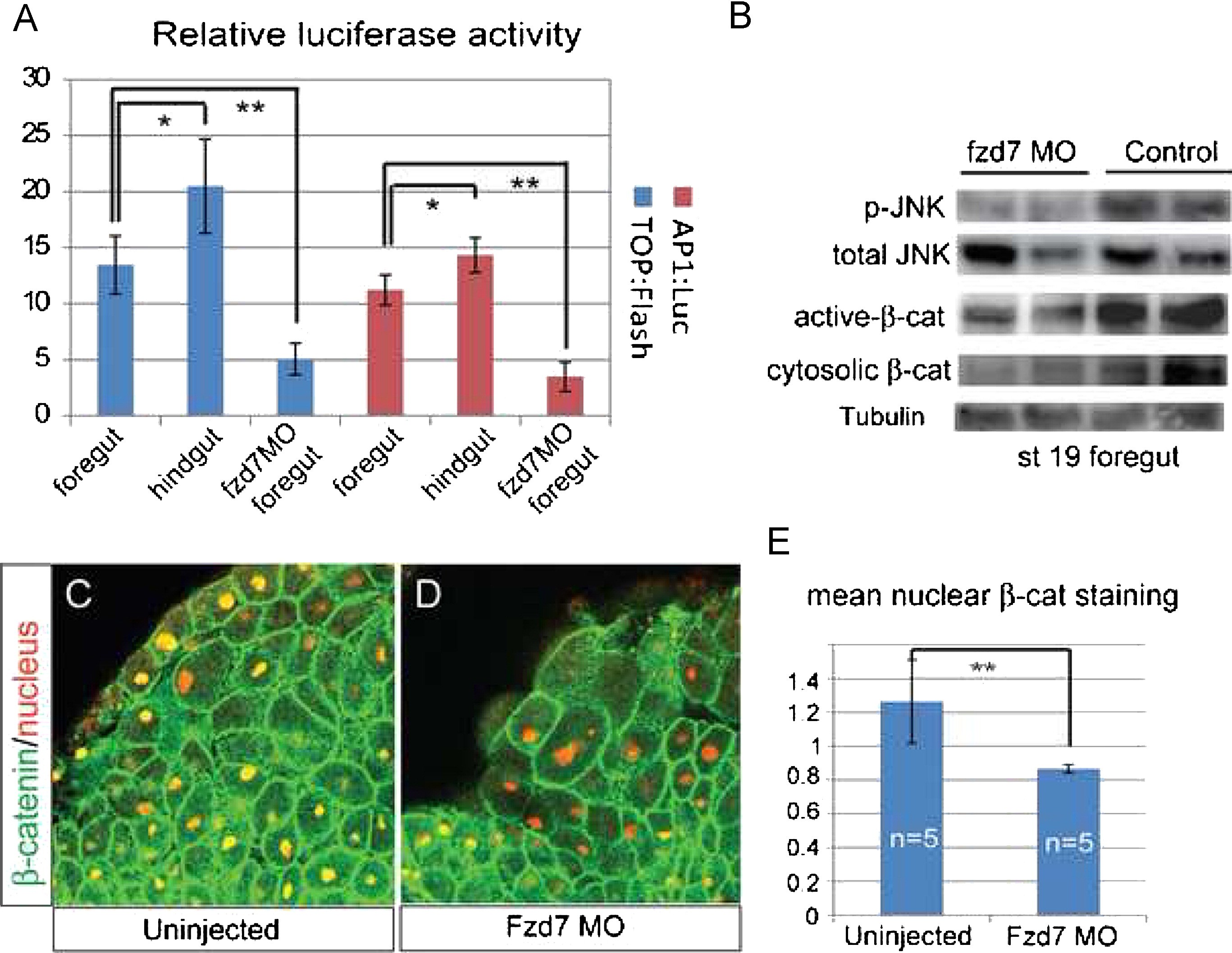 Fig. 5. Fzd7 depletion results loss of both Wnt/β-catenin and Wnt/JNK activity in the foregut. (A) Fzd7-depletion resulted in a reduction of β-catenin/Tcf and JNK/AP1 activity in the foregut. TOP:flash or AP1:Luciferase reporter plasmids were injected into either the D1 foregut endoderm cells or the D4 hindgut endoderm cells at the 32-cell stage, with or without fzd7-MO as indicated. The TOP:Flash reporter is an indicator of β-catenin/Tcf activity, while the AP1:luciferase reporter is an indicator of JNK-mediated c-Jun/ c-Fos (AP1) activity. At stage 20 luciferase activity was measured, in triplicate. The average relative luciferase activity, normalized to co-injected pRTK:Renila, from three biological replicates per condition is shown 7S.D. *po0.05 and ** po0.01 relative to control foregut in Student's t-test. (B) Western blot showed decreased phospho-JNK1/2 (p-JNK) and a loss of dephosphorylated active β-catenin and total cytosolic β-catenin in the foregut explants at stage 19. (C): Confocal immunostaining showed reduced nuclear β-catenin levels in Fzd7 morphant foregut tissue (D) relative to controls (C), at stage 20. (E) Mean pixel intensity of nuclear β-catenin staining measured using Image- J 7S.D (foregut cells were scored from 5 embryos/ condition). |