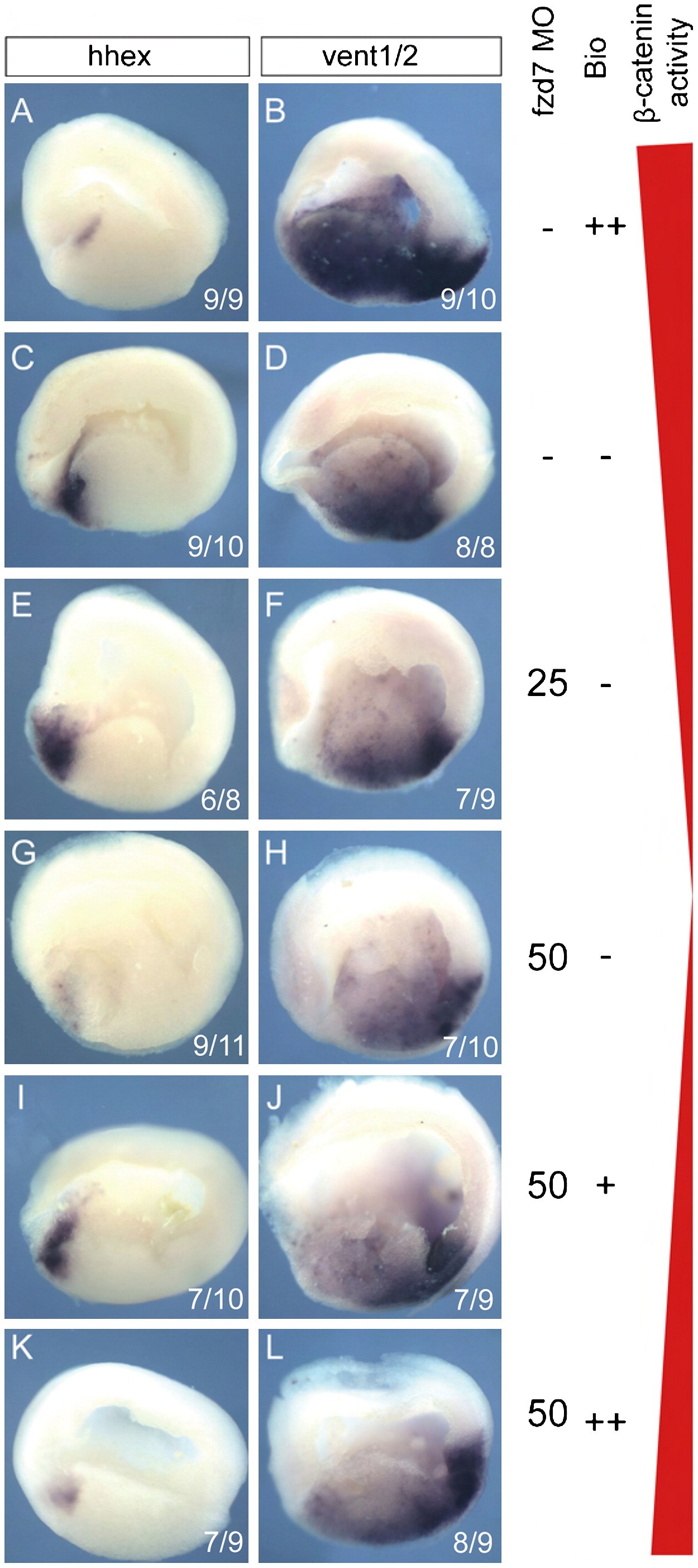 Fig. 7. Multiple thresholds of Wnt/Fzd7/β-catenin activity pattern the endoderm. (A) Fzd7/β-catenin signaling levels were modulated in a dose response with different combination of fzd7-MOs and/or treatment with BIO, a GSK3 inhibitor that stabilizes β-catenin. In situ hybridization of the foregut marker hhex and the mid/hindgut markers vent1/2 in stage 20 embryos showed that increasing dose of BIO and therefore increasing β-catenin activity decreased hhex while expanding vent1/2 (A, B) relative to untreated controls (C, D). A partial knockdown of Fzd7 (25 ng of fzd7-MOs) resulted in a modest increase in hhex and reduction of vent1/2 (E, F), whereas a complete Fzd7 knockdown by 50 ng of the fzd7-MO caused a loss of hhex, which was not accompanied by an expansion of vent1/2 (G, H). A low dose of BIO (5 uM in I,J) rescued hhex expression in fzd7-depleted embryos (I, J), whereas a higher BIO dose (10 uM) resulted in the foregut adopting a hindgut fate and expressing ectopic vent1/2 (K, L). The number of embryos with the illustrated phenotype is indicated in each panel. |