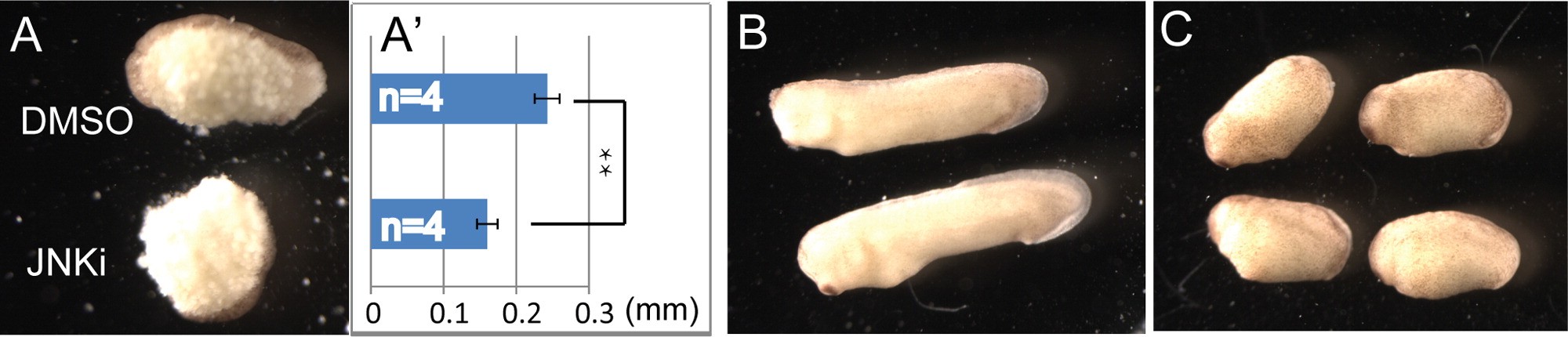 Figure S6. JNK inhibition prevents endoderm elongation: At stage 15 isolated ventral explants: (A) or whole embryos (B,C) were treated with DMSO (A, B) or JNK-inhibitor SP600125 (100 μM) and the length of the explants was measured at stage 30 (A. **p<0.01 relative to age matched controls in T-test |