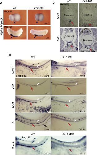 Figure S1, related to Figure 1. Design and testing of the Eto2 morpholinos (MOs) (A) Xenopus laevis has a pseudo-tetraploid genome; genes are therefore present in two �pseudo-allele� forms. Sequence alignment of the beginning of the coding sequence of Eto2 pseudo-alleles A and B and Eto-related genes (top) and of the 5� UTR of Eto2 pseudo-alleles A and B (bottom); the target regions for the �ATG� MO (ETO2-MO) and �5�UTR� MO (ETO2-MO2) are highlighted in yellow and blue respectively. The MOs were designed to have 100% homology to the mRNAs transcribed from both Eto2 pseudo-alleles. The nucleotides in red are conserved between Eto2 and the Eto-related transcripts in the region targeted by Eto2-MO. The Eto-related transcripts (Eto, Mtgr1 and two transcripts with high similarity to Mtgr1, namely Mtgr1-like1 (MGC68858) and Mtgr1-like2 (IMAGE 5156021), accession numbers are in Supplemental Experimental Procedures, section Probes used for in situ hybridisaiton) are not targeted by the Eto2 MOs. For Mtgr1, Mtgr1-like1 and Mtgr1-like2, the sequences targeted by the MOs are sufficiently divergent to avoid unspecific targeting effects. Of note, 5 mismatches are recommended to avoid unspecific targeting effects (Eisen and Smith 2008). Given that only 3 nucleotides differ between the Eto sequence and the sequence recognised by Eto2-MO, the Eto transcripts could potentially be targeted. However, as detailed in Figure S3, they are not expressed in hematopoietic or somitic tissues and are therefore unlikely to have any function in hematopoiesis. The sequences targeted by Eto2-MO2 are too divergent to be aligned; this MO is therefore very unlikely to interfere with translation of any of the Eto-related mRNAs. (B) A GFP-reporter mRNA tethered to the 5� region of ETO2 containing the Eto2-MO target sequence (Eto2:GFP) was used to test the efficacy of the MO in vivo. Embryos co-injected with Eto2-MO and Eto2:GFP mRNA had no visible GFP expression (right panel), as opposed to mRNA alone (middle panel). Eto2-MO is therefore able to bind to its intended target sequence in vivo and to block translation. (C) Expression analysis of the HSC markers Gfi1 and SpiB in Eto2-MO2 injected embryos. Red arrow; DA. Numbers at the bottom of the panels indicate the number of embryos with the given phenotype out of the total number examined. Whole mounts are shown with anterior to the left and dorsal to the top. |