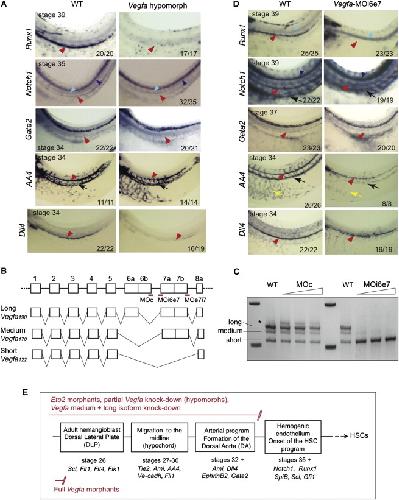 Figure 6. Hypomorphic and Isoform-Specific Knockdowns of Vegfa Phenocopy the Eto2 Morphant Phenotype(A) Hypomorphic VEGFA phenotype. The HSC program was abrogated at stage 39 (loss of Runx1 expression), and the early HSC markers Notch1 and Gata2 were absent at stages 34/35 in VEGFA hypomorphs. DA formation (as revealed by the endothelial marker AA4, at stage 34) is unaffected in VEGFA hypomorphs. Decreased expression of arterial marker Dll4 is observed in the DA of Vegfa hypomorphs at stage 34.(B) Top: structure of Xenopus laevis Vegfa gene. Open boxes, exons; thin lines, introns; not to scale. Red lines show the position of the control MO (MOc) and the MOs targeting the intron6/exon7 (MOi6e7) and exon7/intron7 (MOe7i7) splice junctions. Depicted below are the splicing events giving rise to the three known Vegfa isoforms.(C) Vegfa short, medium, and long mRNA isoforms were detected by PCR from material isolated from stage 27 wild-type (WT) embryos or embryos injected with increasing concentrations of MOi6e7 or control MOc (20, 30, and 40 ng). The ethidium-bromide-stained gel shows knockdown of expression of medium and long mRNA isoforms and increased production of the short isoform in MOi6e7 morphants. Asterisk: the band may represent one of the minor Vegfa isoforms as detected in human and mouse, although this has not been confirmed by sequencing.(D) Vegfa medium and long isoform morphant phenotype (Vegfa-MOi6e7). As for Vegfa hypomorphs (A), expression of Runx1, Notch1, and Gata2 is lost. DA formation is unaffected, as revealed by AA4 expression at stage 34. In contrast to Vegfa hypomorphs, expression of the arterial marker Dll4 appears normal.Red arrowheads, DA; light blue arrowheads, notochord; dark blue arrowheads, neural tube; black arrows, posterior cardinal veins (PCV); yellow arrows, trunk vasculature. Numbers at the bottom of the panels indicate the number of embryos with the given phenotype out of the total number examined. Whole mounts are shown with anterior to the left and dorsal to the top.(E) Schematic diagram detailing the phenotypes of ETO2 morphants, VEGFA hypomorphs, and VEGFA morphants with respect to the definitive HSC program. Molecular markers analyzed in this study are indicated for each stage of development shown.See also Figure S6. |