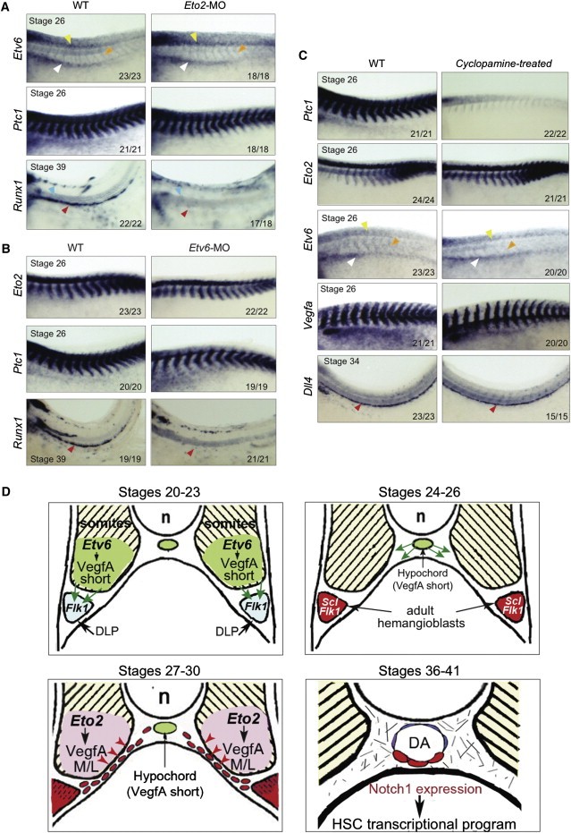 Figure 7. No Epistasis between ETO2, ETV6, and Hedgehog Signaling(AâC) Expression analysis by WMISH of Etv6, Eto2, Ptc1, Vegfa, and Dll4 in Eto2 (A) and Etv6 (B) morphants as well as in embryos treated with cyclopamine (C). Efficiency of Eto2 and Etv6 morpholinos is controlled by Runx1 staining at stage 39, and that of cyclopamine is controlled by Ptc1 staining. Red arrowheads, DA; orange arrowheads, Etv6 staining in the somites; blue arrowheads, notochord; yellow arrowheads, neural tube; white arrowheads, DLP. Numbers at the bottom of the panels indicate the number of embryos with the given phenotype out of the total number examined. Whole mounts are shown with anterior to the left and dorsal to the top.(D) Uncoupling the requirement for VEGFA isoforms during HSC development in Xenopus. Schematic diagram depicting the requirements for VEGFA isoforms in the succession of events leading to HSC formation. Stages 20â23: ETV6 regulates production of VegfA in the somites, VegfA short isoform is critical for correct programming of the adult hemangioblasts in the DLP (green arrows). Stages 24â26: the adult hemangioblasts (or DA precursors) express both endothelial (Flk1) and hematopoietic (Scl) markers and Vegfa in an autocrine manner. The hypochord secretes VegfA short isoform that guides migration of hemangioblasts to the midline (green arrows). Stages 27â30: ETO2 regulates production of VegfA long/medium isoforms (VegfA M/L) in the somites. These isoforms instruct the hematopoietic program of the DA precursors as they migrate along the somites (red arrowheads). Stages 36â41: the DA has formed and is specified as an artery. Cells in the hemogenic endothelium express NOTCH1; this will trigger expression of the HSC transcriptional program. n, notochord. |