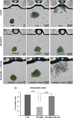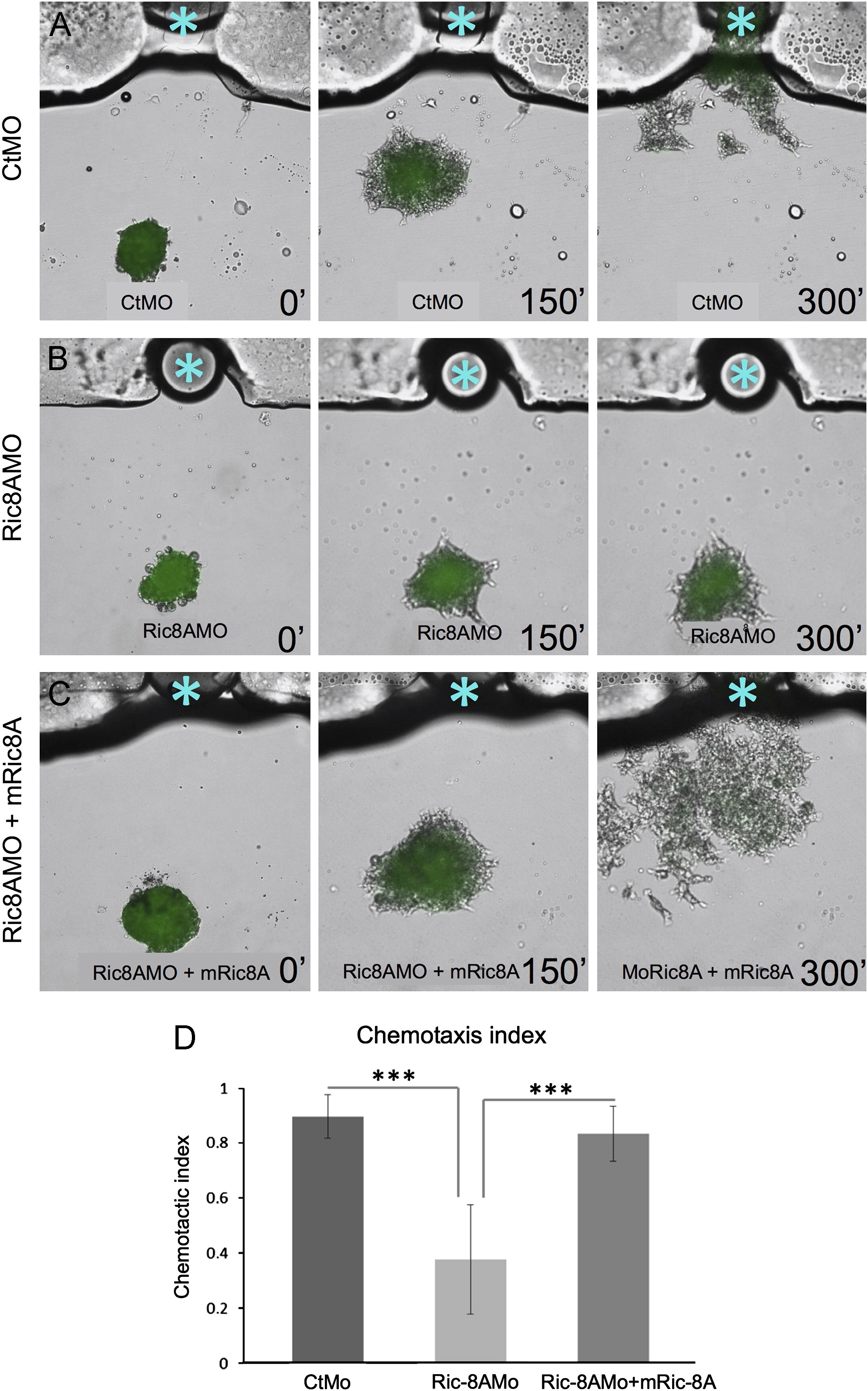 Fig. 3. Ric-8A is required for the migration of cranial NC cells toward Sdf1. In vitro attraction assays performed with cranial NC explanted from embryos co-injected with a mGFP mRNA and a CtMO (A), Ric-8AMO (B) or a mixture of the Ric-8AMO and Ric-8A mRNA (C). Explants from cranial NC cells were exposed to Sdf1 soaked beads (blue asterisk) and the panels show the migratory pattern after 0, 150 and 300 min. (D) Quantification of the results from three independent experiments indicating the average chemotaxis index for each category analyzed. At least 50 cells from 7 different explants were analyzed for each condition. Statistical significance is indicated by *** (P<0.001).