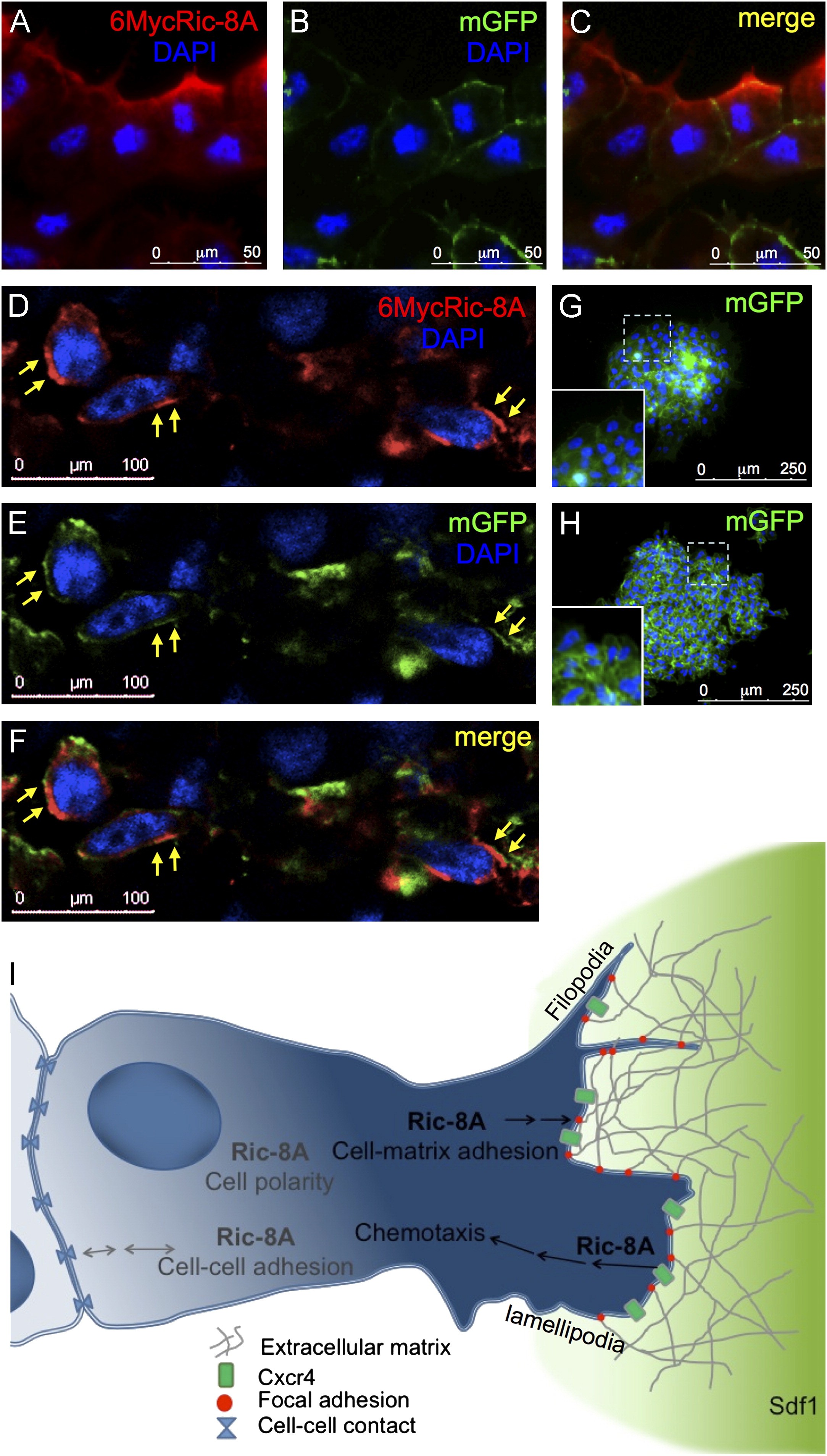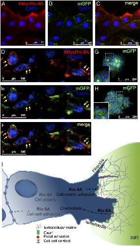 Fig. 5. Ric-8A localizes at the cell membrane of migrating cranial NC cells in vitro and in vivo. (A-C) Cranial NC cells explants from embryos co-injected with the mRNAs coding for 6Myc-Ric-8A and mGFP. The localization of 6Myc-Ric-8A is shown in A (red), the mGFP signal is shown in B (green) and the merged signal is shown in C. Nuclei were counterstained with DAPI (blue). The images are representative of three independent experiments analyzing 10 explants. (D-F) Cranial NC precursor cells from embryos co-injected with the mRNAs coding for 6Myc-Ric-8A and mGFP were transplanted into a WT host embryo. At migratory stages embryos were sectioned and analyzed. The localization of 6Myc-Ric-8A is shown in D (red), the mGFP signal is shown in E (green) and the merged signal is shown in F. Nuclei were counterstained with DAPI (blue). Arrows show the colocalization of 6Myc-Ric-8A and mGFP. The images are representative of two independent experiments analyzing 4 transplant sections. (G) Control explant from an embryo co-injected with mRNA coding for 6Myc-Ric-8A and mGFP processed as in A-C except that the primary antibody was omitted, the inset shows a higher magnification. (H) Control explants from an embryo injected only with mRNA coding for mGFP and processed as in A, the inset shows a higher magnification. (I) Model depicting the possible functions of Ric-8A during the directional migration of cranial NC cells attracted towards an Sdf1 source (green gradient). Protrusions (filopodia and lamellipodia) can be seen at the border of the group, in the cell toward Sdf1 gradient. Possible Ric-8A function are indicates in gray, and its roles investigated in this study are indicated in black. Arrows show the directionality of regulatory information. Double arrows refer to an unknown signaling direction. The blue gradient represents the cell polarization during migration.