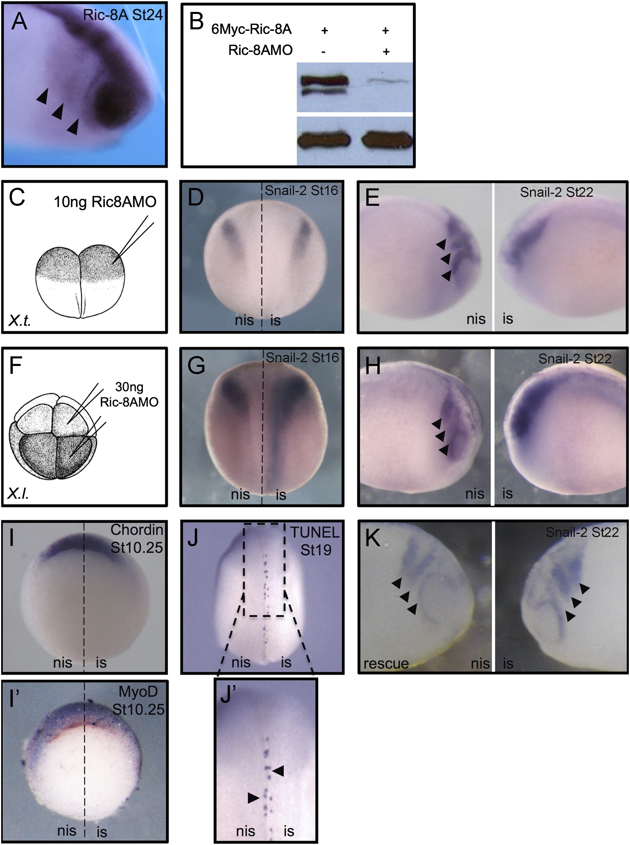 Fig. 1. Ric-8A is required for migration of cranial NC cells in Xenopus tropicalis and Xenopus laevis. (A) Ric-8A is expressed in the NC migration routes at stage 24 (lateral view). (B) Western blot analysis showing that the Ric-8AMO efficiently blocks the translation of a Ric-8A synthetic mRNA. (C-K) Molecular characterization of Ric-8AMO injected embryos. Snail-2 was used as neural crets marker and chordin and MyoD were used as dorsal mesoderm markers. Blue signal in G and H shows β-galactosidase activity used as a lineage tracer. (C) Schematic drawing showing the injection procedure performed in X.t. (panels D, E and I-K). (D) Ric-8A down-regulation shows no effect over neural crest cells induction at stage 16 (dorsal view). (E) Ric-8A knock down inhibits NC cells migration into the three migratory routes at stage 22 (lateral views). (F) Schematic drawing showing the injection procedure performed in X.l. (panels G and H). (G) Ric-8A down-regulation shows no effect over neural crest cells induction at stage 16 (dorsal view). (H) Ric-8A knock down inhibits the migration of NC cells into the three migratory routes at stage 22 (lateral views). (I-Iâ²) Ric-8A down-regulation does not affect chordin and MyoD expression at stage 10.25 (vegetal view). (J) Dorsal view showing the staining from the Tunel. (Jâ²): Dorsal view from a magnification of the region boxed in J. (K) Co-injection of Ric-8MO with a Ric-8A synthetic mRNA is able to rescue the cranial NC cells migration defects at stage 22 (lateral view). Arrowheads in E, H and K show the three cranial NC migratory routes. Arrowheads in Jâ² indicate no difference in the Tunel staining between nis and is. The embryo images are representative of three independent in situ experiments analyzing 20-50 embryos injected for each condition analyzed. Abbreviations: nis, non-injected side; is, injected side.