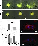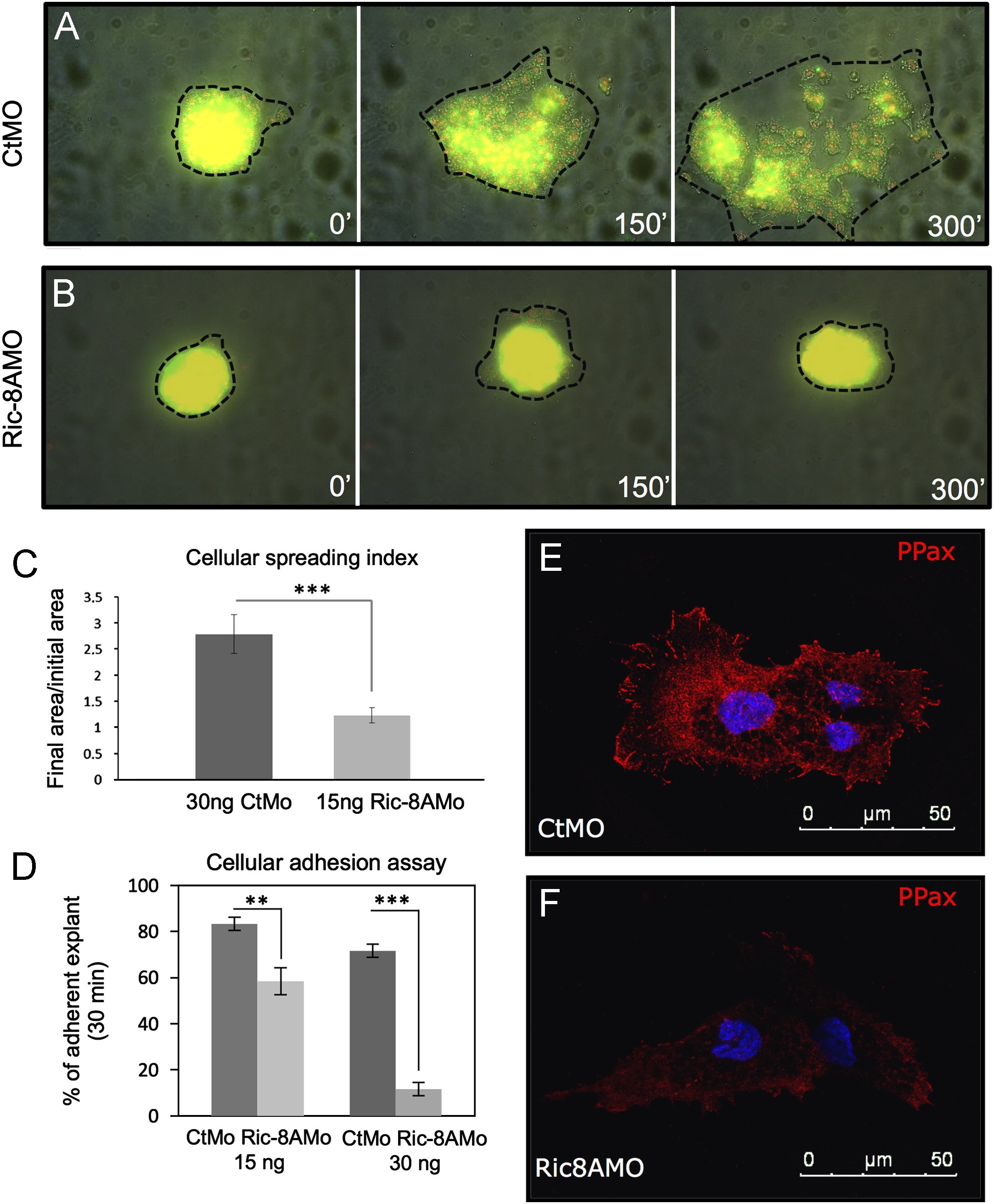 Fig. 4. Ric-8A is required for cranial NC cells spreading and migration by regulating cell adhesion in vivo and in vitro. (A) Cranial NC cells explanted from embryos co-injected with a CtMO and synthetic mRNAs coding for mGFP and nRFP display a normal migratory behavior. (B) Cranial NC cells transplanted from embryos co-injected with the Ric-8AMO and synthetic mRNAs coding mGFP and nRFP fail to spread onto fibronectin-coated dishes. (C) Quantification of the results shown in A and B calculated from three independent experiments indicating the average spreading index from 7 different explants for each category analyzed. Migratory behavior pictures were taken at times 0, 150 and 300 min. Statistical significance is indicated by *** (P<0.001). (D) Quantification of three independent cellular adhesion experiments from at least 20 to 30 explants for dish with two different MO concentrations, indicating the percentage of adherent explants. Statistical significance is indicated by *** (P<0.001). (E) Phospho-paxillin antibody staining (red) of cranial NC cells explanted from embryos injected with CtMO and counterstained with DAPI (blue). (F) Phospho-paxillin antibody staining (red) of cranial NC cells explanted from embryos injected with Ric-8AMO and counterstained with DAPI (blue). The images are representative of three independent experiments analyzing 10 explant for each condition analyzed. The same exposure time was applied to the pictures shown in E and F.