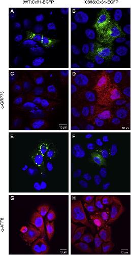Fig. 4. Expression of the Cx31 EKV-causing mutant upregulates components of the unfolded protein response (UPR) pathway. The UPR components BiP/GRP78 (C and D) and ATF6 (G and H) are upregulated in HeLa cells overexpressing the mutant (C86S)Cx31-EGFP (D and H) but not the wild-type construct (WT)Cx31-EGFP (C and G). Furthermore, the ATF6 staining (H) has a more nuclear localisation in cells expressing (C86S)Cx31-EGFP compared to untransfected cells and cells expressing (WT)Cx31-EGFP, indicating that the cleaved amino-terminal portion has been translocated to the nucleus. The DAPI-stained nuclei are shown in blue.