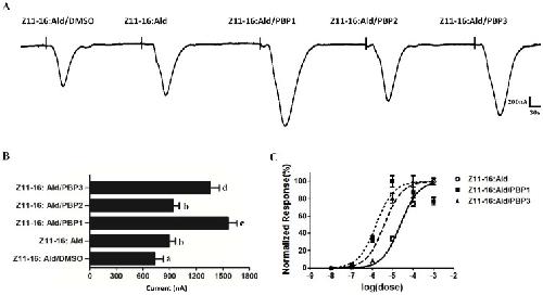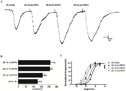 Figure 8. PxylOR4/PxylOrco Xenopus oocytes to Z9, E12-14: Ac of PxylPBP1-mediated (A), PxylPBP2-mediated (B), PxylPBP3-mediated (C)response, respectively.(Left)Inward current responses of PxylOR4/PxylOrco Xenopus oocytes in response to 10−5 M of Z9, E12-14: Ac solubilized by 1XRinger, PxylPBP and 1XRinger successively. (Right) Response profile of PxylOR4/PxylOrco Xenopus oocytes. Error bars indicate SEM (n = 3). Statistical comparison of responses of oocytes was assessed using one-way analysis of variance (ANOVA).