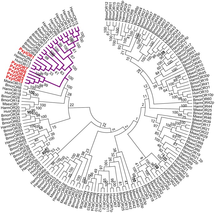 Figure 2. Phylogenetic analysis of six candidate pheromone receptors.The branch colored in purple represents the sub-grouping of pheromone receptors. GenBank accession numbers are listed in Material S1.