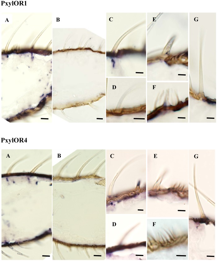 Figure 5. Expression of PxylOR1 and PxylOR4 genes in male antenna of P. xylostella.In situ hybridizations were performed with digoxigenin-labelled antisense RNA probes on longitudinal tissue sections of male antennae. Signals were visualized using an anti-DIG antibody. (A) Hybridization signals in one segment of the P. xylostella antenna are shown. (B) Negative control with a DIG-labeled sense probe. (C) Higher magnification of long trichoid sensilla with hybridization signals. (D) to (G) No hybridization signal was detected under short trichoid sensilla, basiconi sensilla, coeloconic sensilla and chaetica sensilla. Scale bars: 5 µm in A–B and 2 µm in C–G.