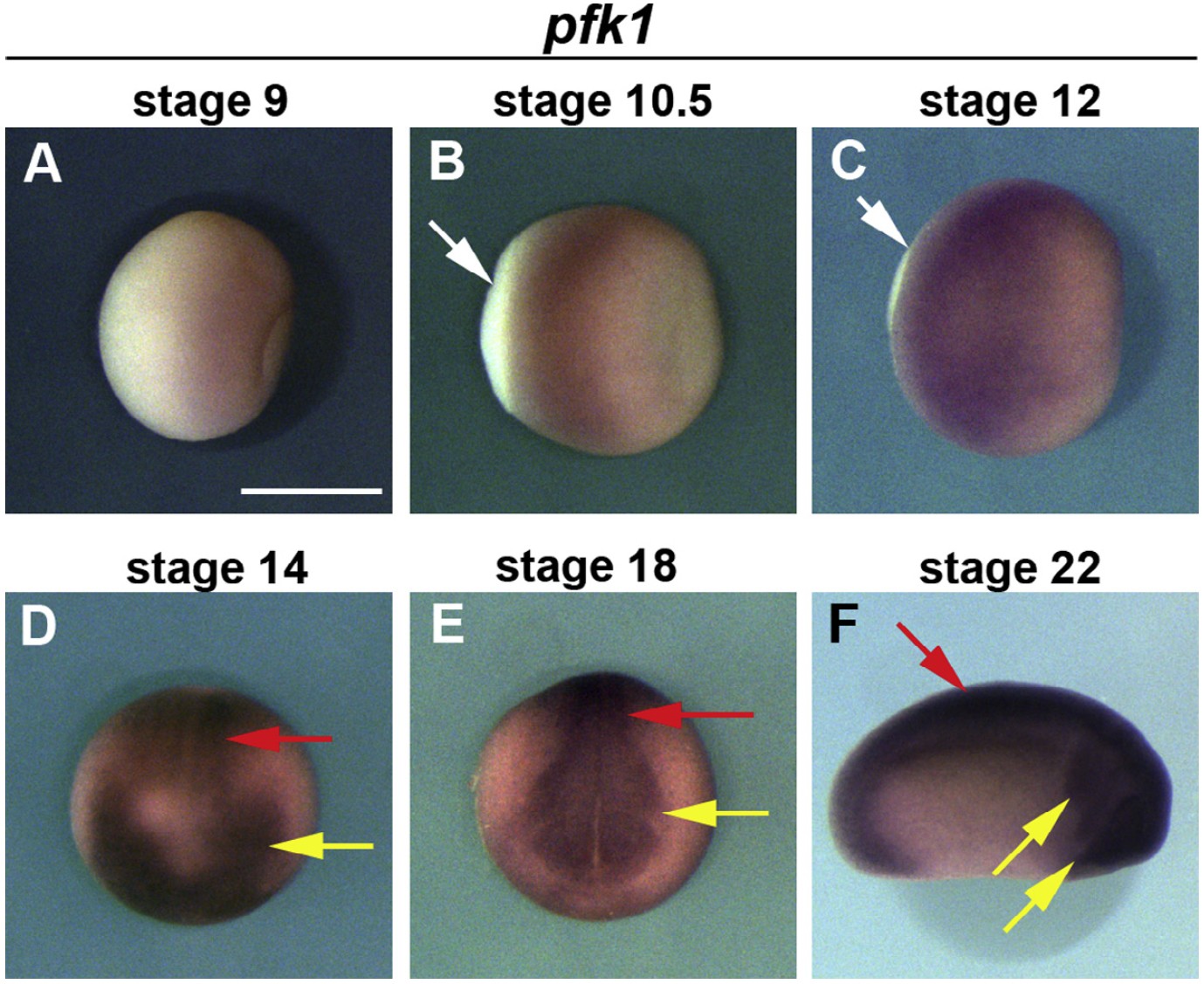 Fig. 2. Pfk1 spatiotemporal expression pattern in Xenopus laevis embryos. Pfk1 expression was analysed by WISH in embryos from the blastula stage 9 until the tailbud stage 22. Expression was observed at cleavage and gastrulation stages (see sense probe staining in Supplemental Fig. 2). Increased expression was observed during later development, notably in the dorsal tissues. (A) Stage 9 blastula embryo shown in lateral view, animal pole on the right; (B) Embryos at gastrula stage 10, 5 and 12 shown in
