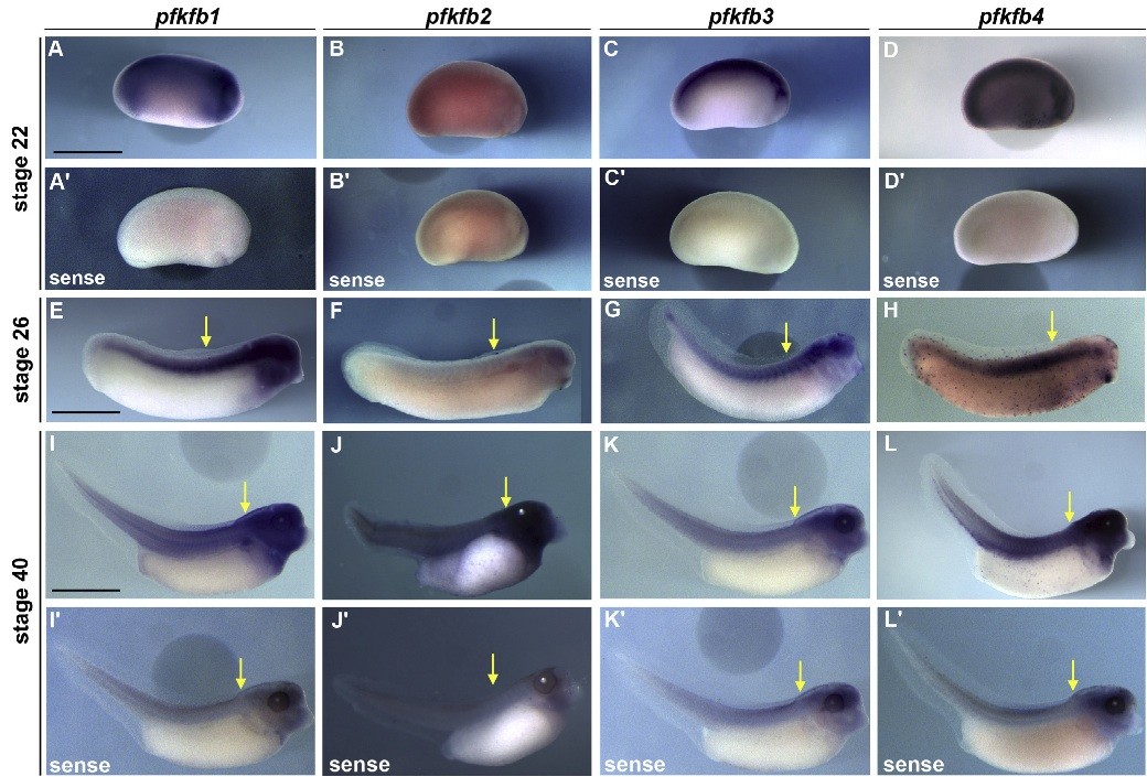 Fig. 5. Pfkfb genes expression patterns during late Xenopus laevis development. The four pfkfb genes are analysed at tailbud stage 22 (A0), at young tadpole stage 26 (E-H) and at swimming tadpole stage 40 (I0 ). Embryos stained with a control sense probe are shown in A0 0 and I0 0 . All the embryos are shown in a lateral view, anterior to the right. Magnification of stage 40 heads are shown in Supplemental Fig. 4. Arrows indicate the level of the transverse section shown in Fig. 6. Bar = 1 mm. |
