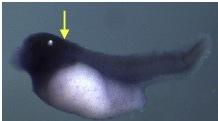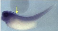 lateral view, dorsal on top (white arrows indicate the blastopore lip); (D) Embryos at neurula stages 14 and 18 shown in dorsal view, anterior on the bottom (red arrows indicate the neural plate and yellow arrows the neural crest and the preplacodal field). (F) Stage 22 tailbud embryo shown in lateral view, anterior on the right (red arrow indicates the dorsal side of the embryo; yellow arrows indicate the prospective craniofacial region). Bar = 1 mm. |