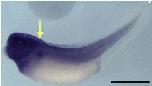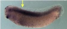 pfkfb4 ( 6-phosphofructo-2-kinase/fructose-2,6-biphosphatase 4 ) gene expression in Xenopus laevis embryos, NF stage 14, as assayed by in situ hybridization, dorsal view, anterior right. |