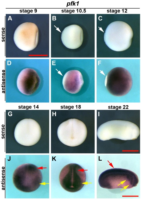Pfk1 expression pattern in Xenopus laevis embryos. Pfk1 expression is shown in X. laevis embryos from blastula stage 9 until tailbud stage 22. A sense probe control (A-C, G-I) and an antisense probe staining (D-F, J-L) are shown at each stage of development. (A-F) Embryos are shown in lateral view, animal pole on the right (A, D) or dorsal on top (B, C, E, F). (G, H, J, K) Embryos are shown in dorsal view, anterior on the bottom. (I, L) Embryos are shown in lateral view, anterior on the right. White arrows (B, C, E, F) indicate the blastopore lip. Red arrows (J, K) indicate the neural plate and (L) the dorsal side of the embryo. Yellow arrows (J, K) indicate the neural crest and the preplacodal field and (L) the prospective craniofacial region. Bar = 1 mm |