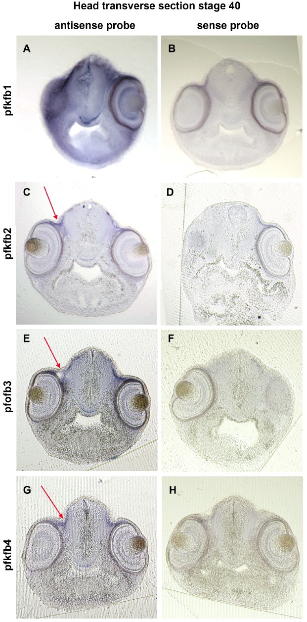 Pfkfb genes expression in the head and eye of X. laevis tadpoles. Transverse sections at eye level are shown for tadpole embryos at stage 40. Vibratome sections were cut from embryos stained with antisense (A, C, E, G) and sense (B, D, F, H) probes. Arrows indicate the expression in head mesenchyme. No expression was observed with control sense probe, while low level expression was seen for pfkfb2-4 and high expression for pfkfb1. |