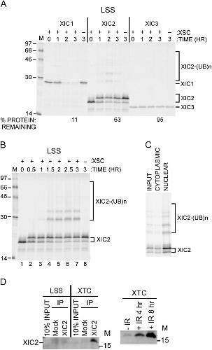 Figure 1. Xic2 is ubiquitinated and degraded in a DNA dependent manner. A. Degradation assay. 35S-methionine labeled Xic1, Xic2, and Xic3 were incubated in Xenopus interphase egg extract (Low Speed Supernatant, LSS) in the absence (-) or presence (+) of Xenopus sperm chromatin (XSC) for 0 to 3 hours as indicated. The mean percentage of remaining protein from two independent experiments is shown (% protein remaining) where the zero hour time point was normalized to 100%. Xic1, Xic2, and Xic3 protein bands are marked on the right including ubiquitinated [(UB)n] forms of Xic2. B. Xic2 ubiquitination assay. 35S-methionine labeled Xic2 was incubated in LSS with methyl ubiquitin (3 mg/ml) to stabilize the ubiquitinated species in the absence (-) or presence (+) of XSC for 0 to 3 hours as indicated. Xic2 protein bands are marked on the right including ubiquitinated [(UB)n] forms. C. Nuclei spin down assay. Nuclei spin down assay was employed to separate cytosolic (CYT) and nuclear fractions (NUC) after incubation of [35S]-methionine labeled Xic2 with LSS containing XSC. The input (INPUT) represents 1/15th of the sample before centrifugation and the cytosolic (CYT) represents 1/15th of the cytosolic fraction after centrifugation. Xic2-(UB) n denotes ubiquitinated Xic2. D. Xic2 immunoblot. Left panel: Xenopus LSS or XTC cell extracts were immunoprecipitated (IP) using anti-Xic2 (XIC2) or normal rabbit serum (Mock) antibody and then immunoblotted with anti-Xic2 antibody. Ten percent of the immunoprecipitation reaction was loaded directly (10% INPUT). Right panel: XTC cells were treated with gamma irradiation (IR, 10 Gy) and harvested 4 or 8 hrs following treatment. Lysates were then examined by immunoblotting with anti-Xic2 antibody. For all figures, the molecular weight marker (M) is shown in kilodaltons.