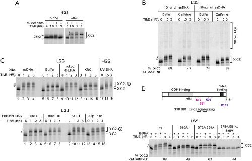Figure 6. Single-stranded DNA-dependent Xic2 phosphorylation at residues S78/S81 is sensitive to caffeine treatment. A. Phosphorylation shift assay. 35S-methionine labeled Chk2 and Xic2 were incubated in HSS with (+) or without (-) annealed oligonucleotides DNA (dsDNA ends, 100 ng/ul) for 0 to 3 hrs as indicated. B. Xic2 degradation assay. 35S-methionine labeled Xic2 was incubated in LSS with 10 ng/ul or 50 ng/ul ΦX174 single-stranded DNA (ssDNA) in the presence of XB- (buffer) or 10 mM caffeine for 0 to 3 hrs as indicated. The mean percentage of remaining Xic2 from two independent experiments is shown (% Xic2 remaining) where the zero hour time point was normalized to 100%. C. Phosphorylation shift assay. 35S-methionine labeled Xic2 was incubated in LSS or HSS as indicated with ΦX174 (ssDNA), XB- (Buffer), nicked pCS2+ plasmid DNA (nicked dsDNA), XSC, UV-irradiated plasmid DNA (UV DNA), uncut plasmid DNA (Uncut), HindIII linearized plasmid DNA (HindIII), StuI linearized plasmid DNA (StuI), or Asp718 linearized plasmid DNA (Asp718) at 10 ng/ul final DNA concentrations for 0 to 3 hrs as indicated. D. Xic2 degradation assay. Top panel: Schematic representation of Xic2 with potential S/T-P and S/T/-Q phosphorylation sites and the proximal sequences surrounding the S/T-Q sites of Xic2. Bottom panel: 35S-methionine labeled Xic2 wildtype (WT) or mutants (S98A, S78A/S81A, or S78A/S81A/S98A) were incubated in LSS with (+) or without (-) 10 ng/ul ΦX174 single-stranded DNA (ssDNA) for 0 to 3 hrs as indicated. The mean percentage of remaining Xic2 from two independent experiments is shown (% Xic2 remaining) where the zero hour time point was normalized to 100%. In all figures, the caret (<) and asterisks (*) indicate the slower migrating phosphoforms of Xic2 and phosphorylated Xic2 is also indicated as XIC2-P.