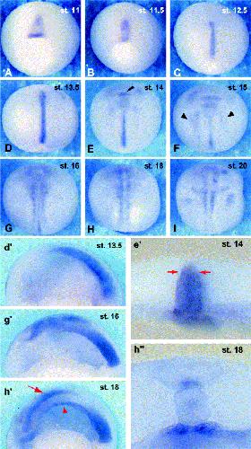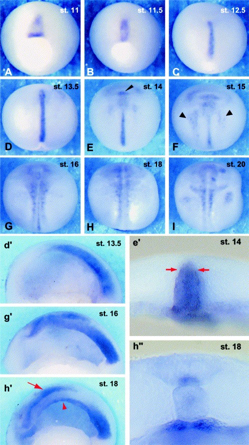 Fig. 2. Early expression of Xencr-1. (AâC) Vegetal view of Xencr-1 during gastrula stages, dorsal side up. (A) st. 11. (B) st. 11.5. (C) st. 12.5. Xencr-1 expression begins at st. 11 in the medial dorsal marginal zone above the blastopore (A) and converges toward the dorsal midline and extends anteroposteriorly during gastrulation (B, C). (DâI) Dorsal view of Xencr-1 during neurulation, anterior side up. (D) st. 13.5. (E) st. 14. (F) st. 15. (G) st. 16. (H) st. 18. (I) st. 20. Xencr-1 expression extends to the prechordal mesoderm by st. 13.5 (E, arrowhead) and by stage 14 begins to be expressed in the anterior and lateral neural folds (F, arrowheads) of the trunk region of the embryo (intermediolateral deep cells of [Schroeder, 1970]. Expression in the pronephric anlage is seen at st. 20 (I).Sagittal section at st. 13.5 (dâ²) and transverse section at st. 14 (eâ²) reveal that Xencr-1 is expressed throughout the dorsal midline tissues, the dorsal-most endoderm, notochord, and median deep cells of the neuroectoderm. Red arrows in (eâ²) indicate the neural ectoderm/notochord boundary. Sagittal section at stage 16 (gâ²) reveals that expression is being down-regulated in the anterior notochord, while sagittal and transverse sections at st. 18 (hâ²), (hâ²) demonstrate that expression is maintained in anteriorhypochord (hâ², arrowhead) and floorplate (hâ² arrow; median deep cells of [Schroeder, 1970].