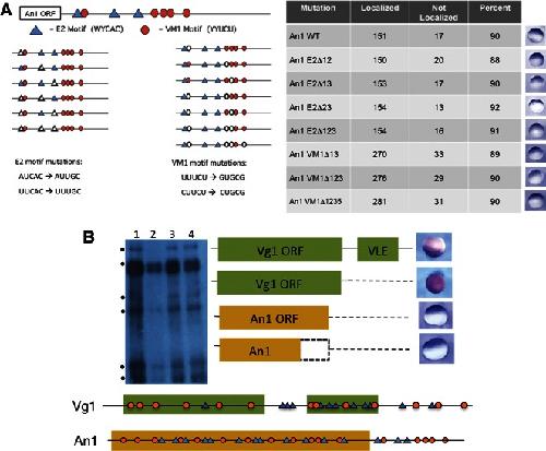 FIGURE 3. Functional localization signals extend throughout the length of An1 mRNA. (A) Scheme showing the location of E2 and VM1 motifs in the An1 3′ UTR targeted for mutagenesis (left). Empty symbols represent sites of mutation. Localization phenotypes of injected RNAs (right). Following immunohistochemical staining of oocytes injected with DIG-labeled RNA, each was visually judged for localization. Representative oocytes injected with each RNA are shown along the side of the table oriented with the animal hemisphere upward. (B) UV cross-linking and localization assays of Vg1 and An1 mRNAs. Full-length Vg1 mRNA (lane 1) is cross-linked to the six core group of proteins. Deletion of the Vg1 3′ UTR, which removes the VLE, eliminates cross-linking of the binding proteins (lane 2) and abolishes localization of the RNA. Deletion of the An1 3′ UTR (lane 3) or the 3′ UTR and the last 850 nt of the ORF (lane 4) do not eliminate cross-linking activity or localization of these mutant RNAs.
