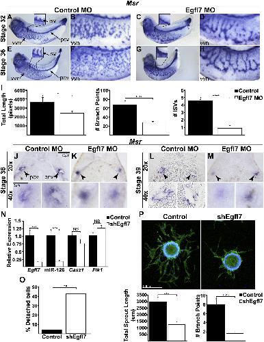 (I) Quantification of vascular defects in control and EGFL7-depleted embryos (stage 36) representing total vessel length, number of branch points within the vvn, and number of isv/embryo. Data represent mean � SEM (n = 7 control and 10 Egfl7 MO embryos). ∗p < 0.05, ∗∗p < 0.01, ∗∗∗∗p < 0.0005.
