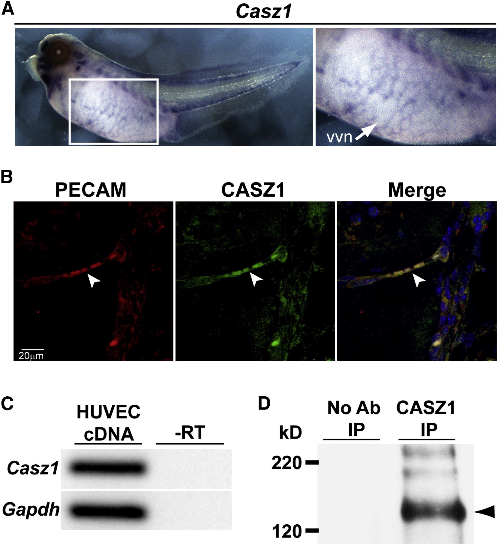 (D) IP of CASZ1 from HUVECs. Control lane (left) represents IP with no antibody (Ab). Arrowhead represents 125 kD human CASZ1. See also Figure S1.