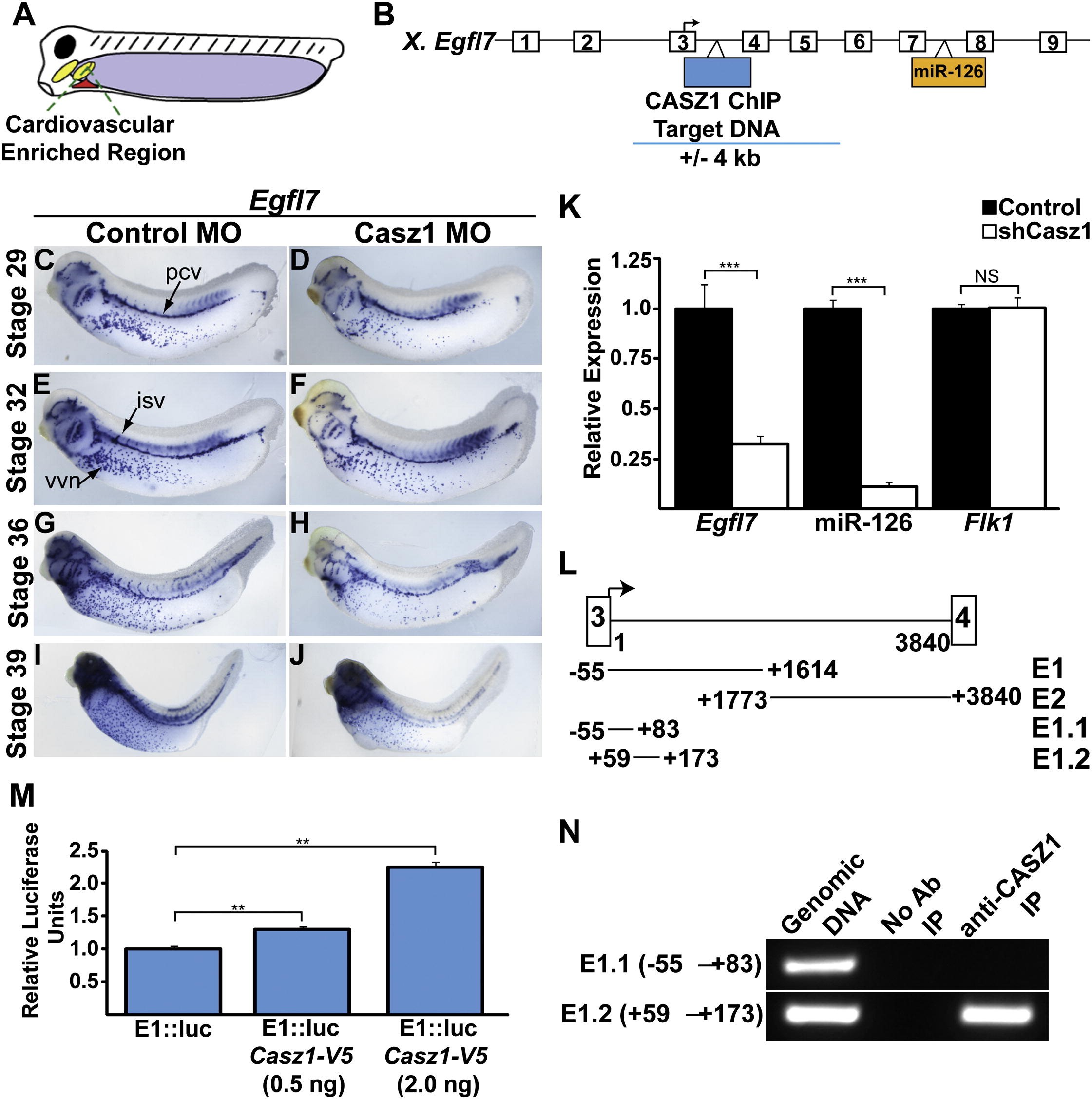 (M) Egfl7 genomic region E1 in the presence or absence of Casz1. Bars represent fold increase in activity relative to control � SEM. Experiments were repeated twice on independent batches of embryos; ââp < 0.01.
