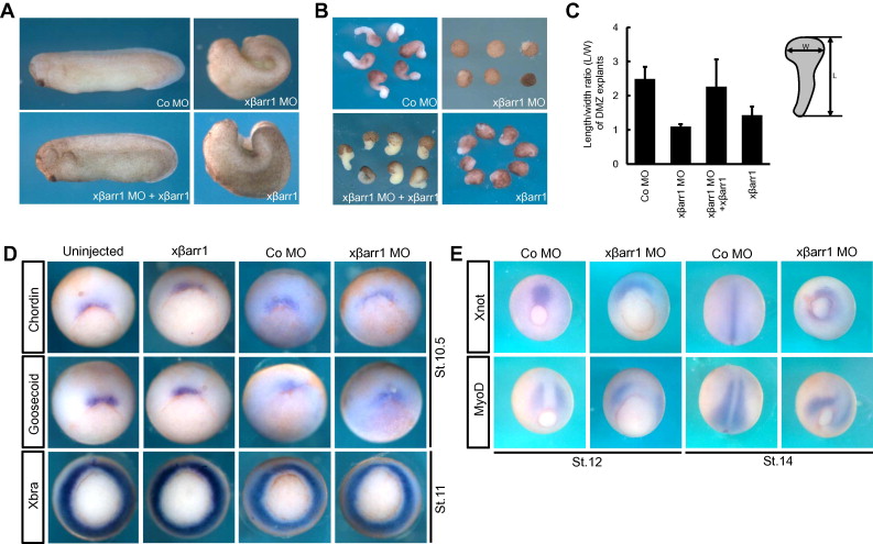 Fig. 2. xbarr1 regulates CE movements of dorsal tissue with no effect on cell fates. (A) Gain- and loss-of-function phenotypes of xbarr1. (B) DMZ elongation assays. (C)