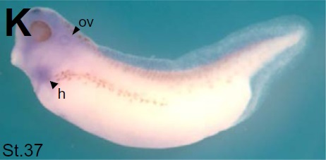 arrb1 (arrestin, beta 1) gene expression in Xenopus laevis embryo, assayed via in situ hybridization, NF stage 37, lateral view, anteriorleft, dorsal up.