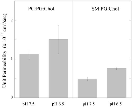 Fig. 6. Single-channel (unit) permeabilities for AQP0 in bilayers composed of POPC:POPG:cholesterol and SM:DPPG:cholesterol at pH 7.5 and at pH 6.5.