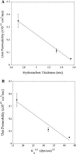 Fig. 7. Single-channel (unit) water permeabilities at pH 7.5 for AQP0 in bilayers composed of POPC:POPG, POPC:POPG:cholesterol, and SM:DPPG:cholesterol plotted as a function of (A) bilayer hydrocarbon thickness and (B) the square-root of bilayer area compressibility modulus