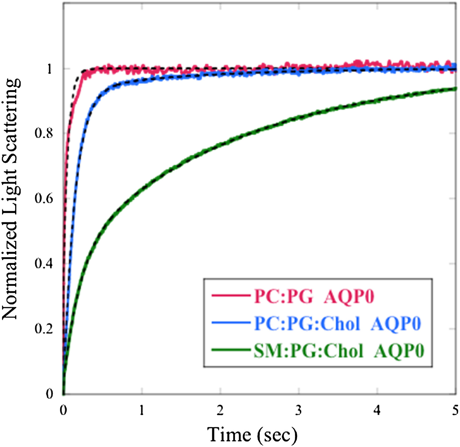 Fig. 2. Traces of osmotic gradient-driven changes in light scattering for proteoliposomes containing AQP0 at similar protein/lipid (P/L) molar ratios: POPC:POPG (P/L = 0.002) (red), POPC:POPG:cholesterol (P/L = 0.002) (blue), and SM:DPPG:cholesterol (P/L = 0.003) (green). The light scattering traces were normalized as in Fig. 1. Although data were recorded for a 20-s time period in order for the SM:DPPG:cholesterol trace to plateau, the light-scattering data are displayed for only the first five seconds to better show the differences among the three lipid systems. Double-exponential fits to the data are shown as dotted black lines with fits to all data sets in this paper giving RMSE <0.005.