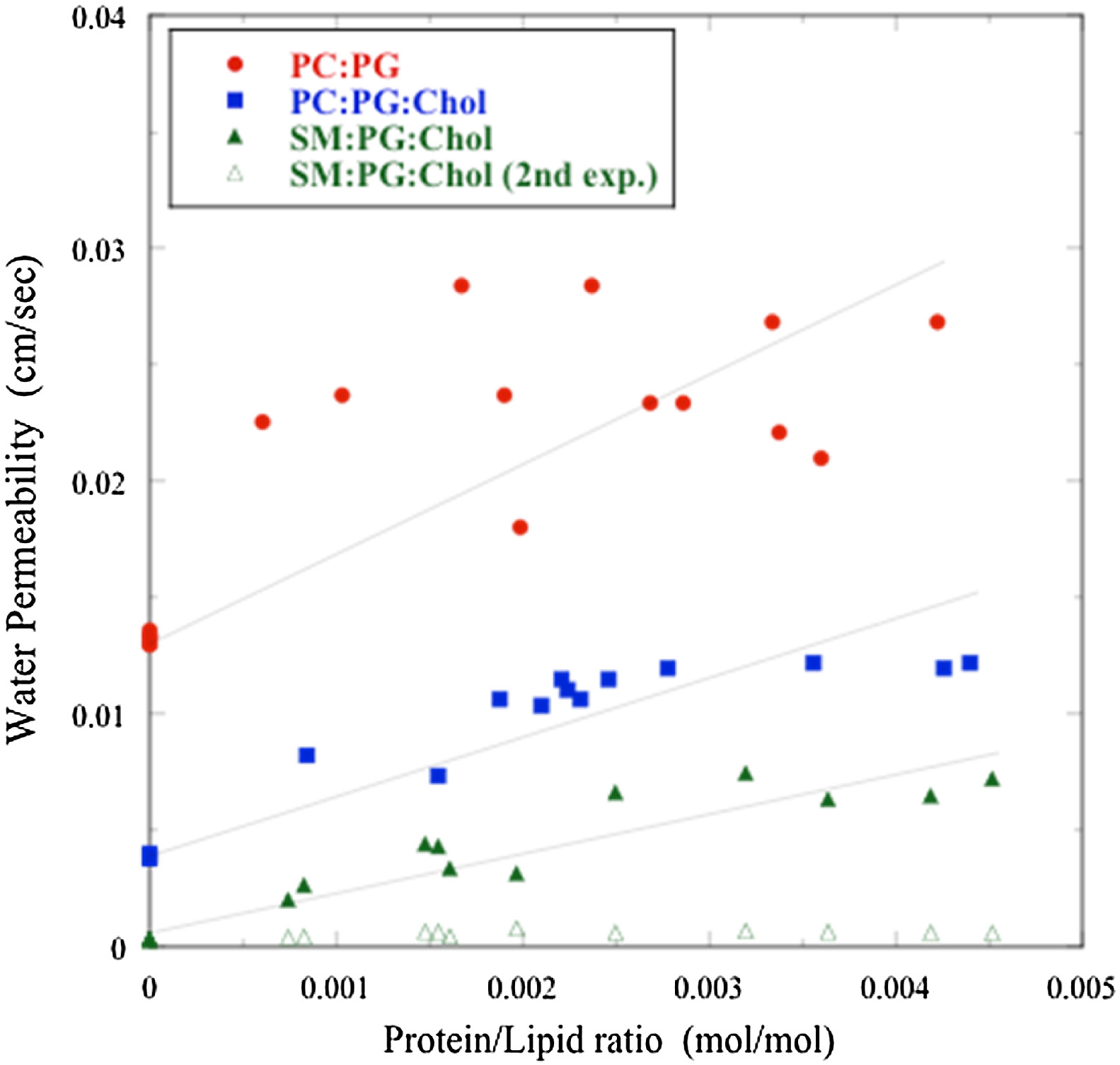 Fig. 3. Plot of proteoliposome permeability (pf) as a function of molar protein/lipid (P/L) ratio for AQP0 in bilayers composed of POPC:POPG (red circles), POPC:POPG:cholesterol (blue squares), and SM:DPPG:cholesterol (green triangles). For each lipid composition fits to the osmotic gradient-driven traces (Fig. 2) yielded two shrinkage rates, with k1 giving values of pf that increased linearly with increasing values of P/L (solid symbols), and k2 giving values of pf that were nearly independent of P/L (open green triangles show these values for SM:DPPG:cholesterol).