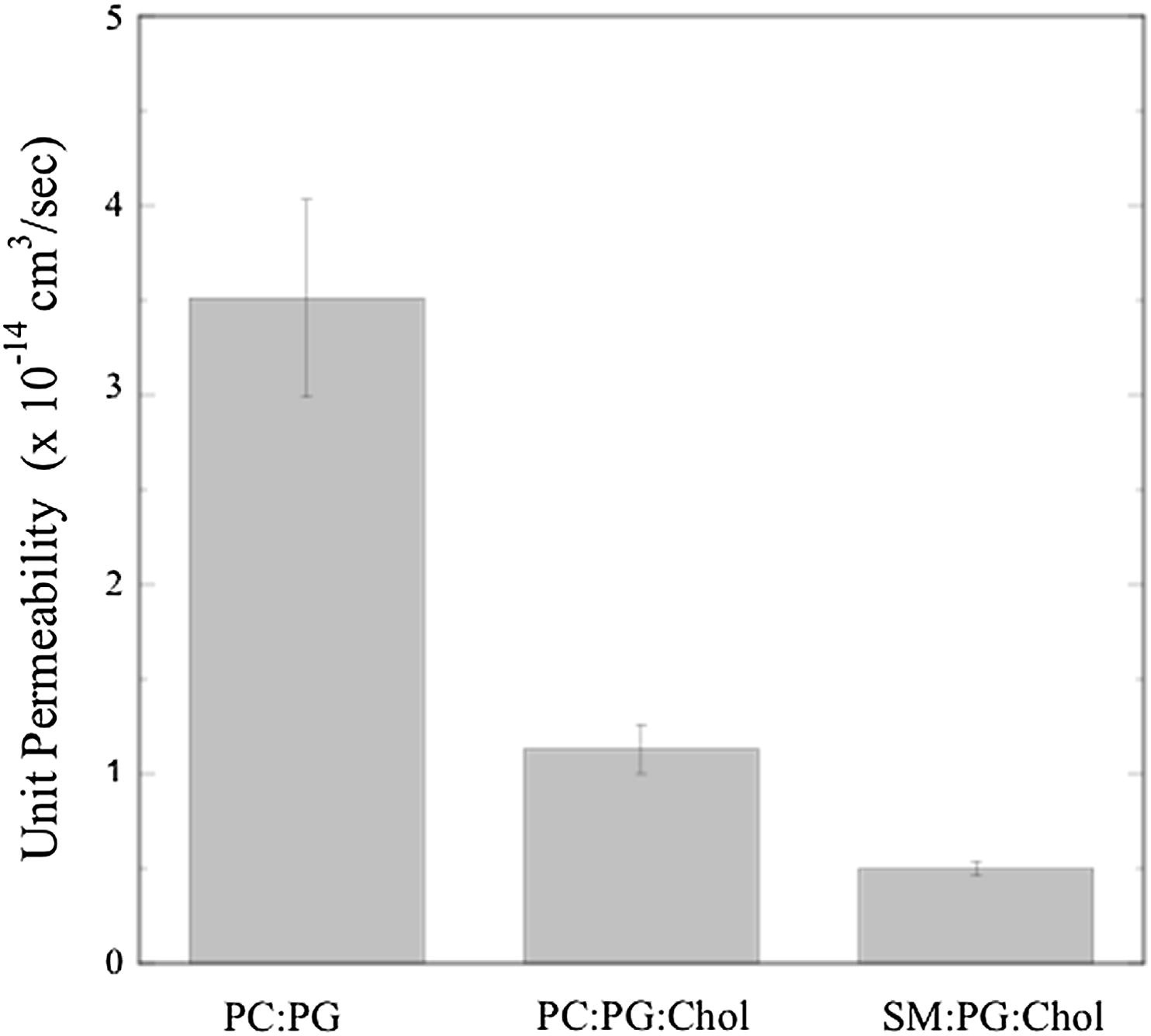 Fig. 4. Single-channel (unit) permeabilities for AQP0 for bilayers composed of POPC:POPG, POPC:POPG:cholesterol, and SM:DPPG:cholesterol obtained at pH 7.5. (For simplicity, the lipid labels on the x-axis do not include the relevant PG.)