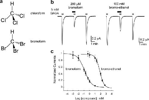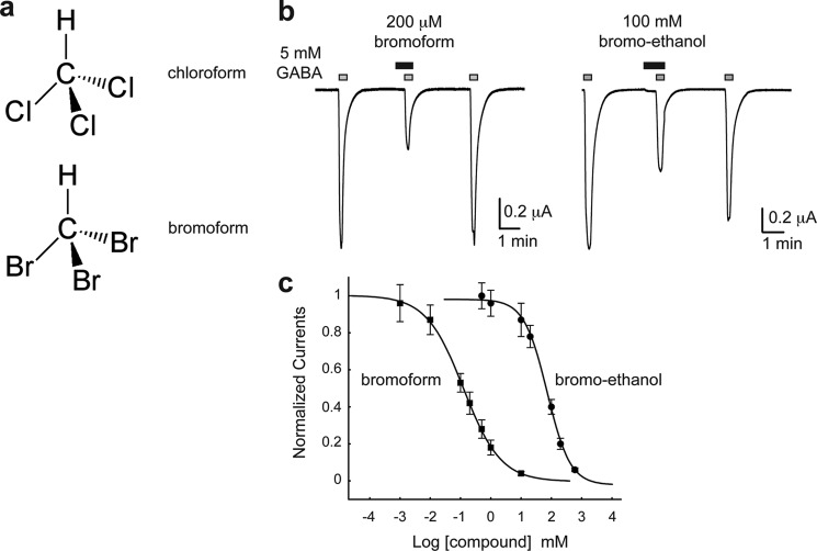 a, chemical formulas of chloroform and bromoform. b, ELIC current traces were evoked by application of 5 mm GABA in the absence and presence of 200 μm bromoform or 100 mm bromoethanol. c, concentration-inhibition curves from the experiments shown in panel b. Squares are data for bromoform, and circles are data for bromoethanol (mean ± S.E.). Each data point represents the average of 3–10 experiments. |