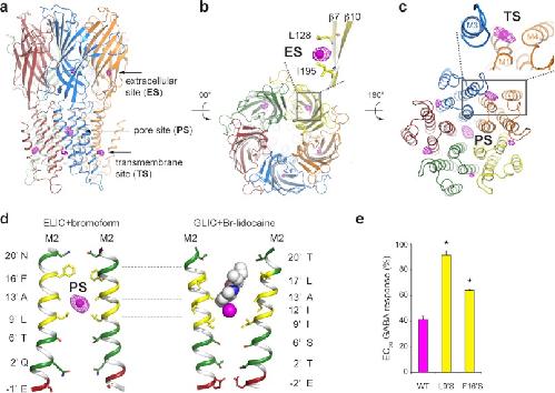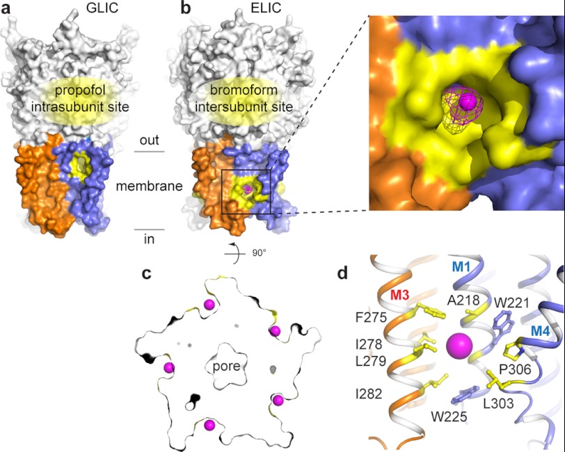 a and b, Comparison of the propofol binding site in GLIC (a) and the bromoform binding site of ELIC (b) in a surface representation. Propofol binds in an intrasubunit pocket in the upper half of the transmembrane domain. Bromoform binds in an intersubunit pocket farther down the transmembrane domain. The transmembrane domains of two neighboring subunits are shown in orange and blue. The propofol and bromoform pockets are highlighted in yellow. The extracellular domain is shown in white. The inset shows a more detailed view of the intersubunit transmembrane site. The magenta mesh represents anomalous electron density contoured at 4σ. c, cross-section through a surface representation of ELIC. The intersubunit bromoform site is formed at a pre-existing cavity, which is occupied by a bromoform molecule (single bromine atoms are shown as magenta spheres) in all five sites. d, detailed view of the amino acid residues in ELIC that form the intersubunit bromoform site (highlighted in yellow). The site is formed at the interface between M1 and M4 of one subunit (blue) and M3 of the neighboring subunit (orange). |