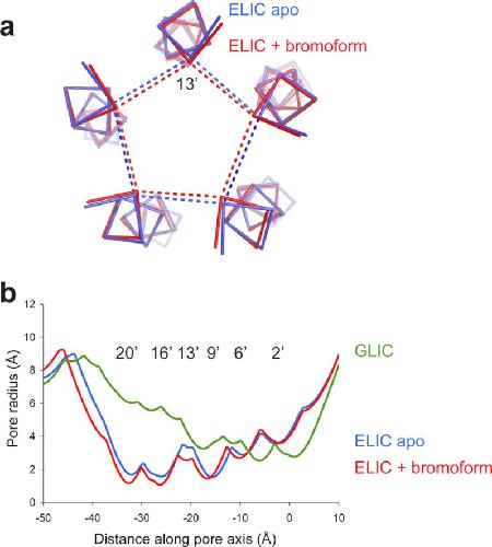 a, ribbon representation of the pore-lining M2-helix in the apoELIC structure (blue, PDB code 2vl0) and the bromoform-bound structure (red). The view is along the five-fold symmetry axis looking down on the channel pore from the extracellular domain. The dashed lines are distance measurements between 13′A Cα atoms of different subunits. b, pore radius analysis for apoELIC (blue), bromoform-bound ELIC (red), and GLIC, which likely corresponds to an open pore conformation (PDB code 3eam). |