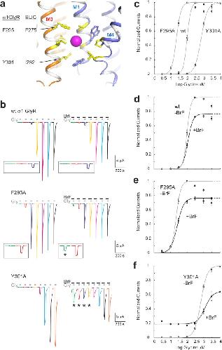a, graphic representation of the intersubunit bromoform binding site in the transmembrane domain of ELIC. Interacting residues are shown in yellow sticks. The bromoform molecule is shown as a single magenta sphere. b, two-electrode voltage clamp recordings from oocytes expressing wild type α1 GlyRs, F295A, and Y301A mutants. Each current trace is shown in a specific color to facilitate comparison of the range of glycine concentrations: 3 μm (green), 10 μm (red), 30 μm (blue), 100 μm (yellow), 300 μm (magenta), 1 mm (cyan), and 3 mm (black). To reach saturation for Tyr-301 receptors, we also applied 10 mm (orange). Each oocyte was exposed to the same range of glycine concentrations in the presence of 200 μm bromoform (BrF). The insets for WT and F295A show a magnified view of traces obtained at low glycine concentrations. The asterisk indicates potentiation by bromoform. c, concentration-activation curves for WT, F295A, and Y301A GlyRs in the absence of bromoform. d–f, concentration-activation curves in the absence (gray line, −BrF) and presence (black line, +BrF) of 200 μm bromoform for WT (d), F295A (e), and Y301A (f) receptors. Error bars in panels c–f indicate S.E. |