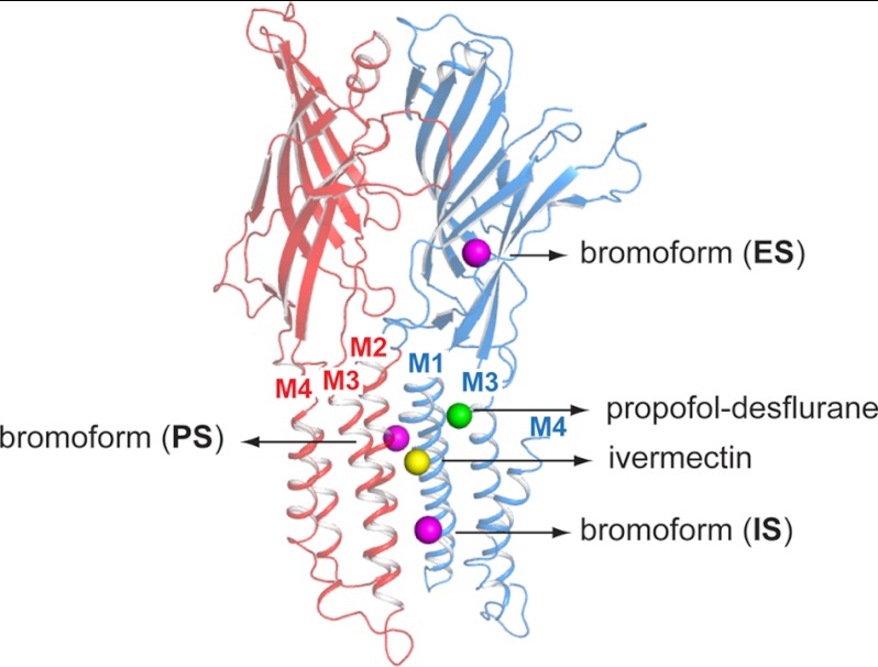 FIGURE 8. Overview of different general anesthetic binding sites revealed in crystal structures of pLGICs. A graphic representation of two neighboring subunits of the ELIC pentamer is shown. The different spheres correspond to different binding site for general anesthetics: the propofol-desflurane site (green) (18), the alcohol-ivermectin site (yellow) (14), and the three bromoform sites identified in this study (magenta). ES, extracellular site; PS, pore site; IS, intersubunit site). |